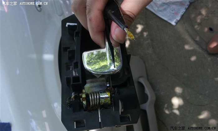 既然拆下了,顺便把相关的机械部件清洁一下,比如门轴和拉手,都抹点油,润滑润滑,前面说过,驾驶位的拉手有点松,拆下后发现,原来是拉手里面卡弹簧的塑料缺了一块,装的时候就给挪到后排去了,后排的好的挪到前面,反正左后门我也开了童锁,不用的。