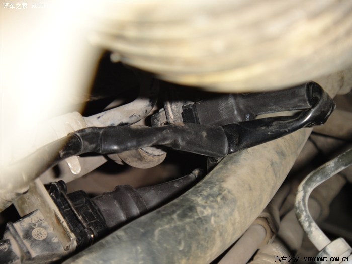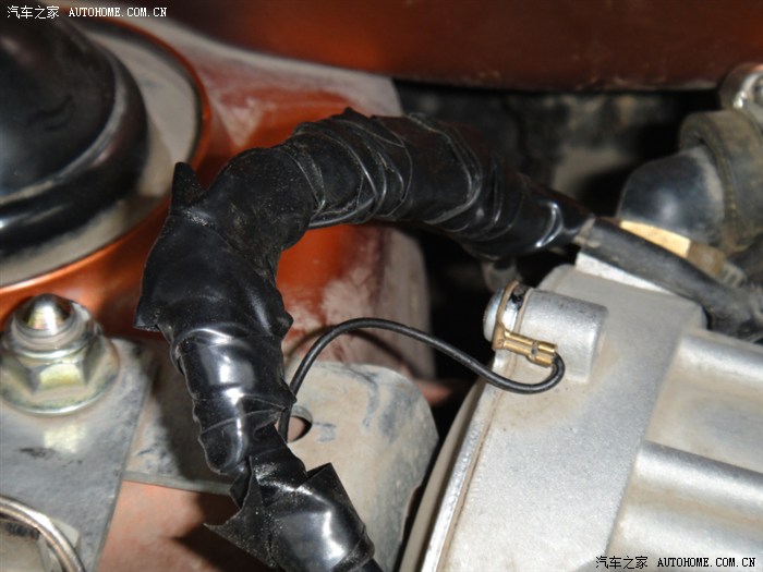 在节气门旁边的这个就是节气门位置感应器,里面有三要线,一根5V电源线,一根接地,还有一根是信号线。(这是风云2两厢车的,三厢貌似不太一样)。这根棕白色线就是我们要找的信号线,把线剖开,把万用表打到直流20V档,黑色接地,红色搭到线上进行测量,发动机点火后,这根线的电压应该在0.5V,用手轻轻搬运节气门旁边的油门接线加油,电压给上升,这根就是了(找了我好几天,累死了)OK,把蓝黑色线接到上面,记得做好防水