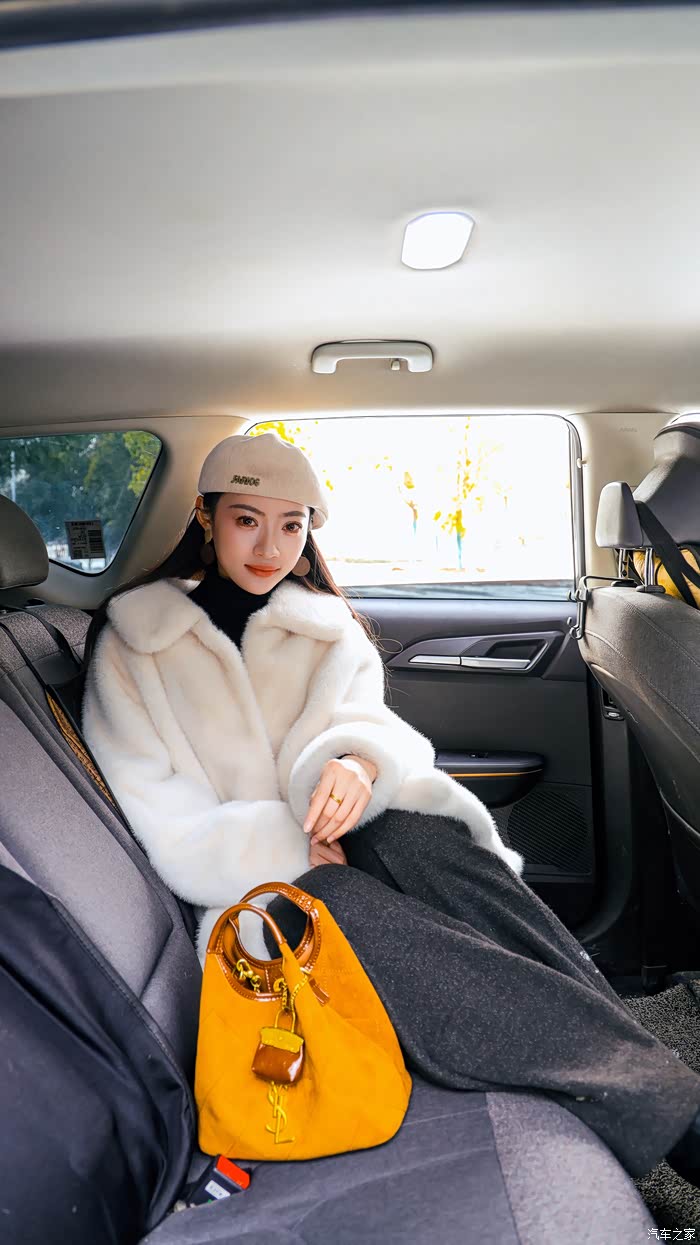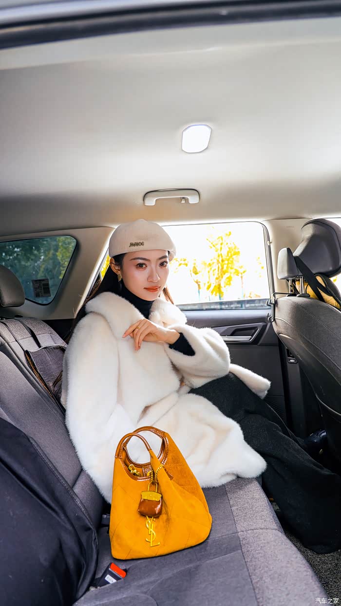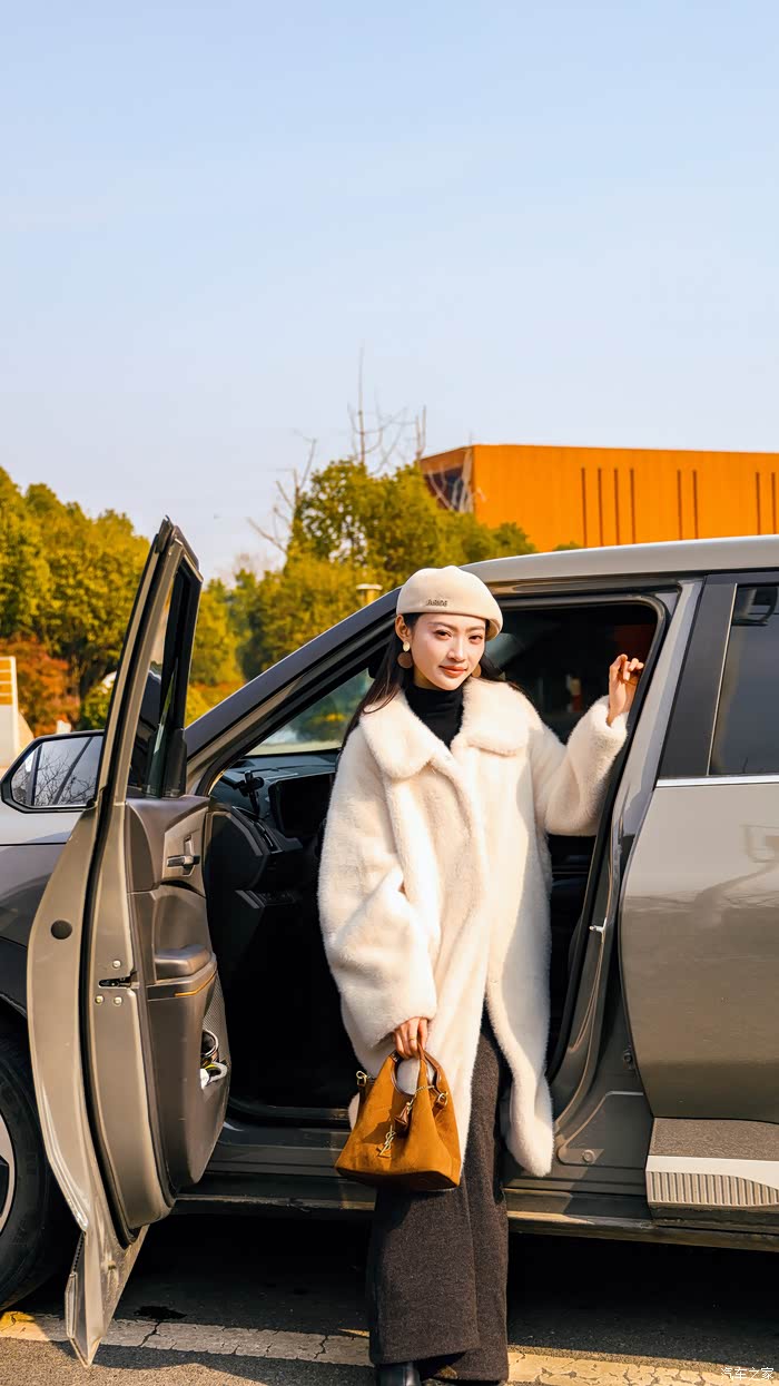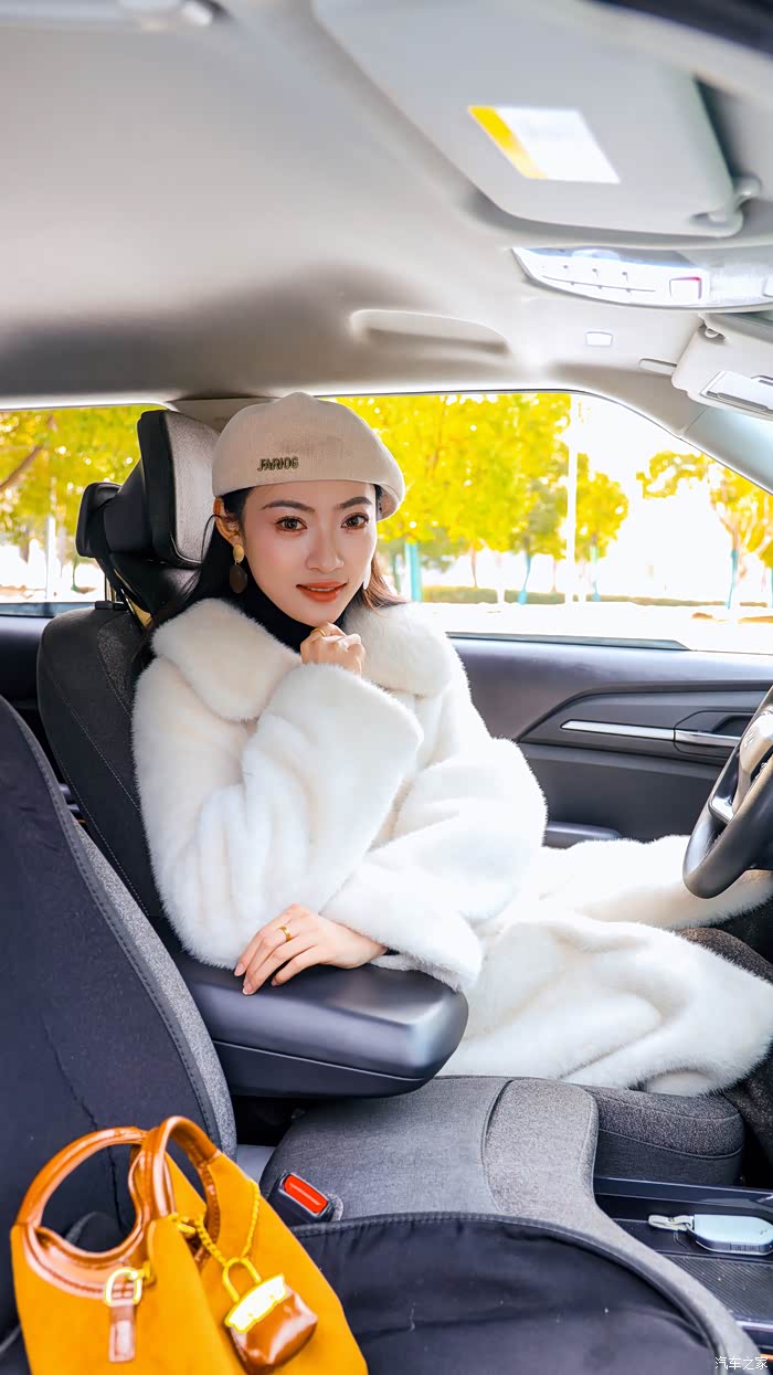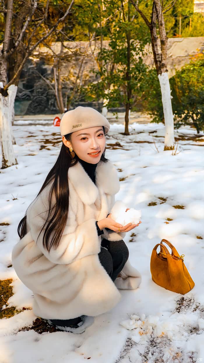 换了一身白色毛大衣的Yaaa,戴着贝雷帽在雪地里显得格外温婉。雪后的公园很静,但Yaaa 玩得像个孩子。她蹲在车头前,捧起雪花笑意盈盈的看着我,还不时站起身来,开心地对着镜头挥手互动。阳光落在雪地上白晃晃的,衬得她的笑容格外明亮。比起那些刻意摆拍的姿势,我更喜欢捕捉这种不经意间的生动。在这样安静的冬日午后,这些瞬间被定格下来,不再是那种冷冰冰的看图说话,而是一个鲜活、有温度的用车日常。