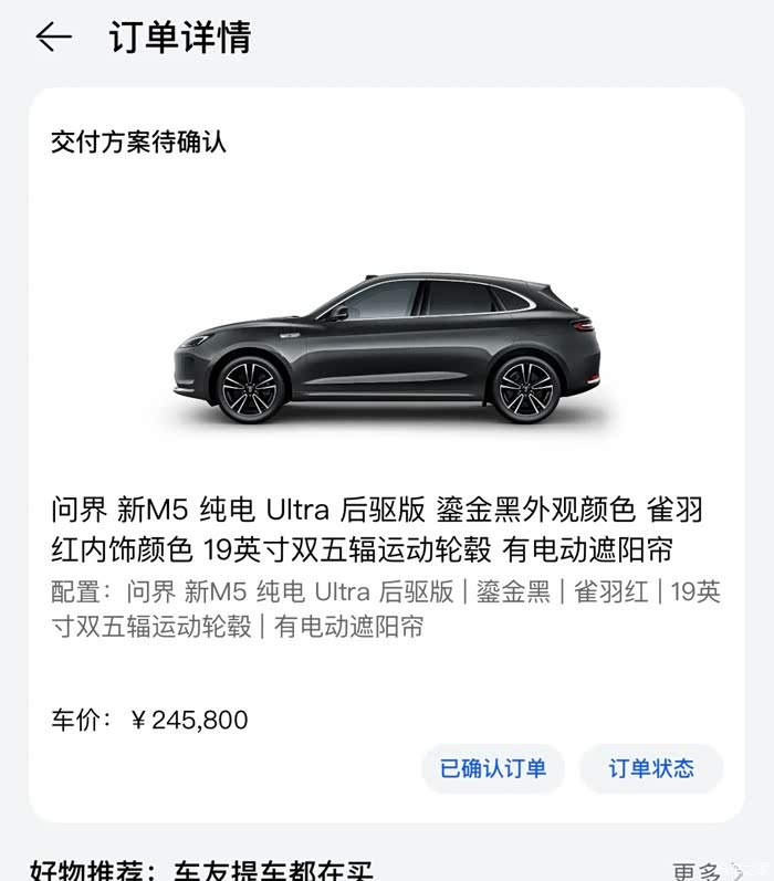 综合考虑之后我们订了问界新M5Ultra纯电版,赠送的6000元选配金直接加了电动遮阳帘,刚好夏天的时候用得上。品质和用料没啥好说的,光是“史上最强问界M5”这个称号和12小时小订破3000台的预售成绩,就已经能看出大家对问界新M5Ultra的期待了。现在万事俱备,就差提车了,手动艾特官方,加个速吧!