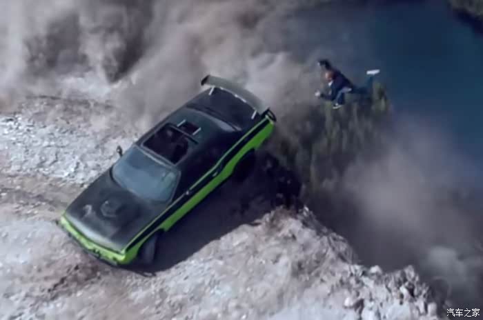 在速激第7部中这场公路追逐和悬崖甩尾的戏,Letty驾驶的绿色黑顶的挑战者。