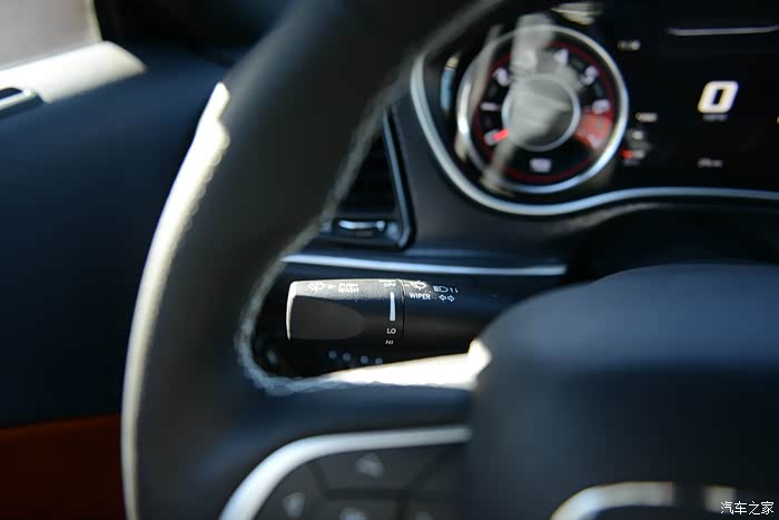 方向盘粗大,真皮包裹舒适。左手的按钮是免提,语音识别,仪表盘信息控制;右手是巡航控制。