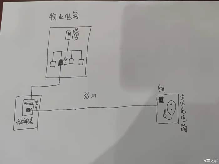 提车近一个月,充电桩装好半个月吧。前3天稳定没事,之后每天一跳闸。天天喊物业的来给我推电。我先灵魂绘图展示下线路的布局。