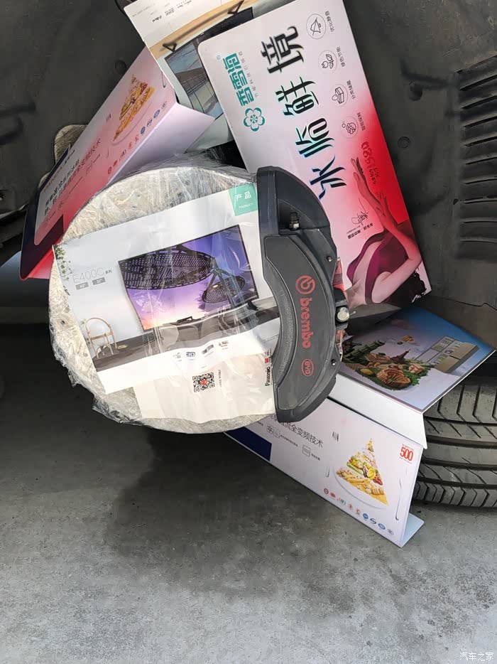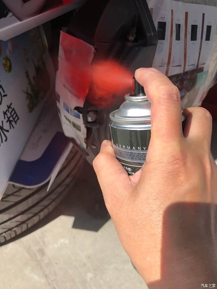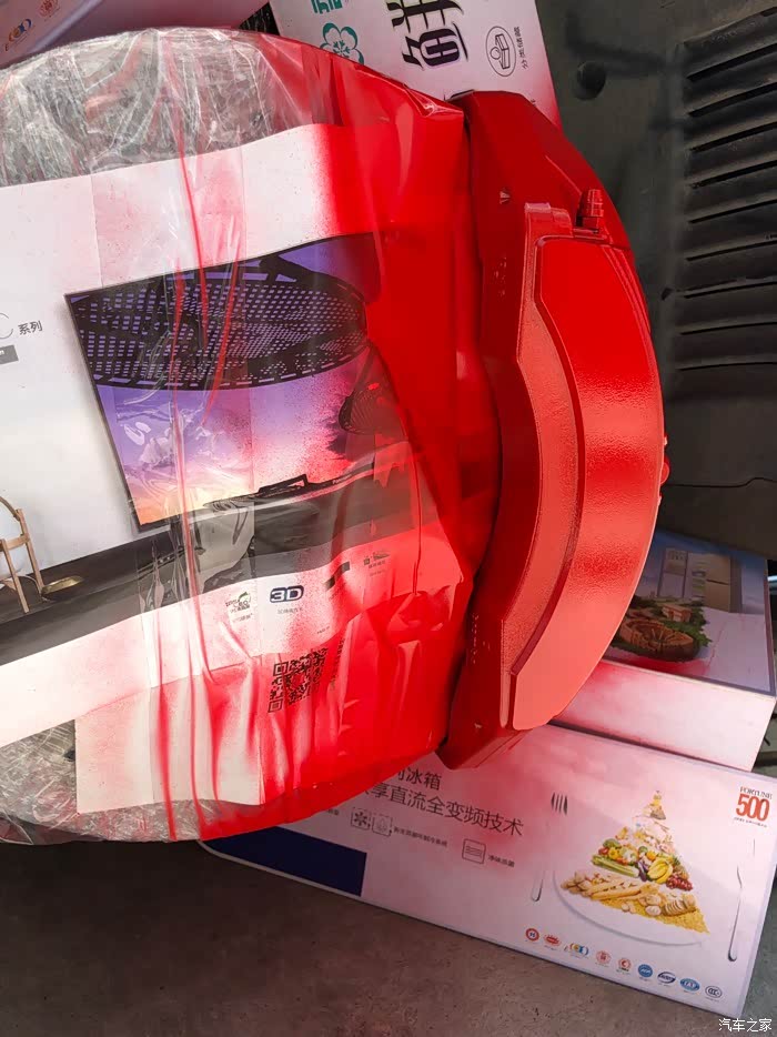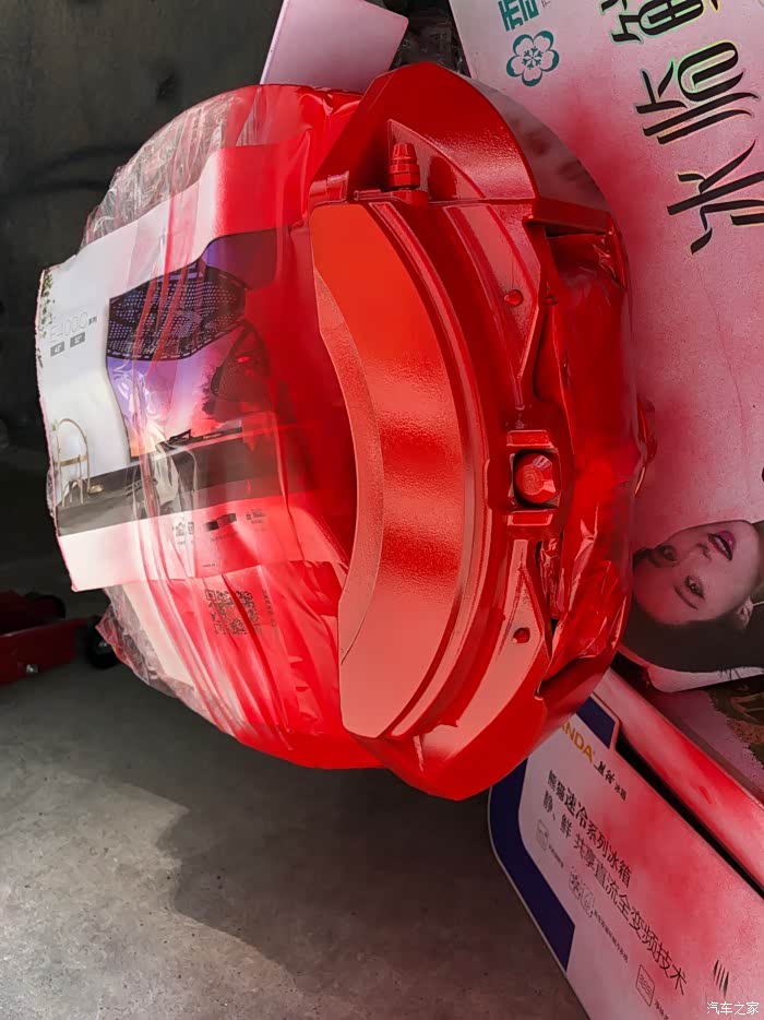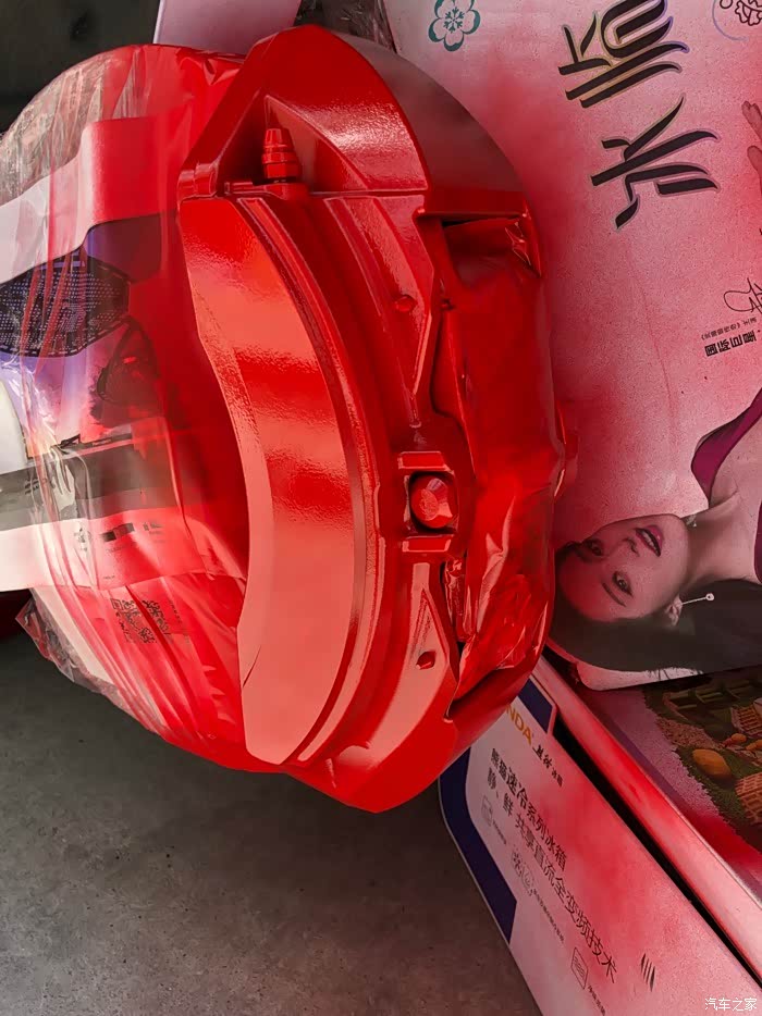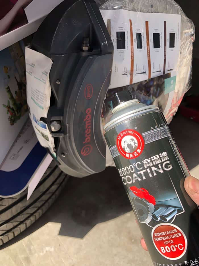 。唯一让我有点意见的是,这卡钳黑灰色的外观,真的有点大跌身价,对不起布雷博专业赛车级刹车卡钳的品牌档次。因为是布雷博为比亚迪唐DM定制版,所以,在成本上也有了一定的降低,不像BBA的布雷博卡钳,大红的、荧光绿的、姹紫嫣红、时尚感十足!对,今天,我就是要自己动手、给布雷博卡钳改色!而且是最时尚的大红色!我在某宝买了800度耐高温卡钳改色专用漆套装(包含红色高温漆一罐、化油器清洗剂一罐、光油一罐、布雷博卡钳标志贴纸一对)。