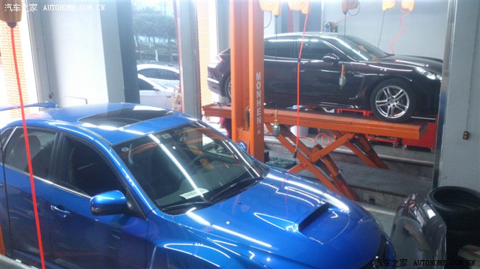 这是传说中的STI,听老板说短距加速性很不错,手动波箱,和M3有的一拼,顿时产生了敬意。 这是正在更换刹车。