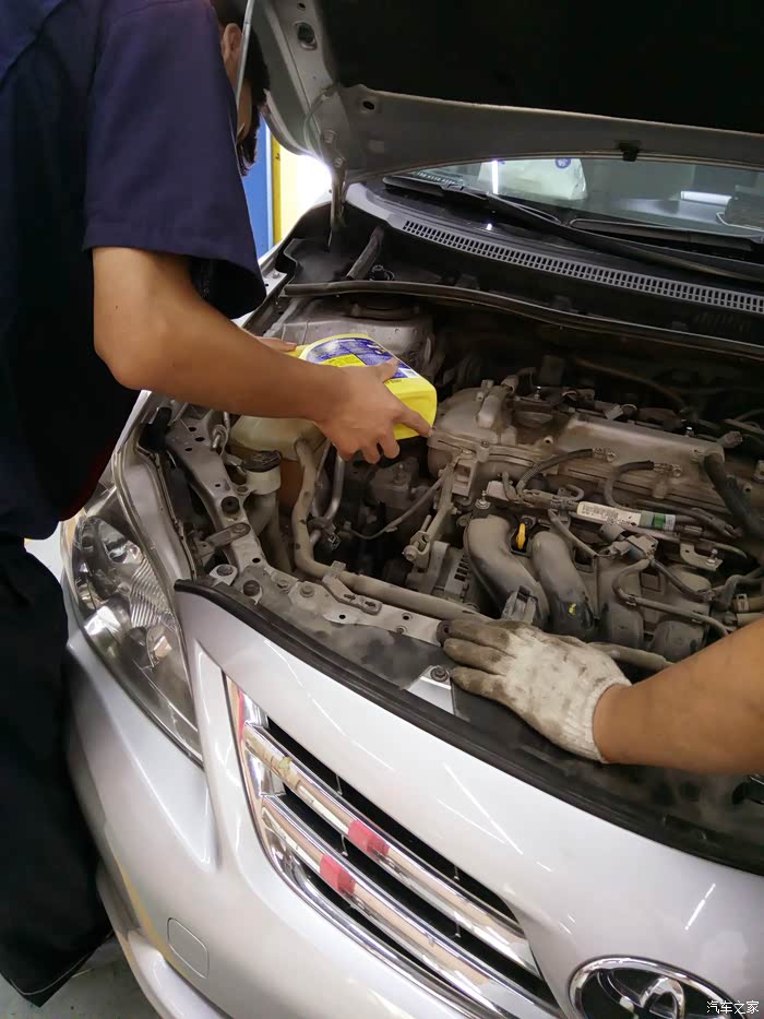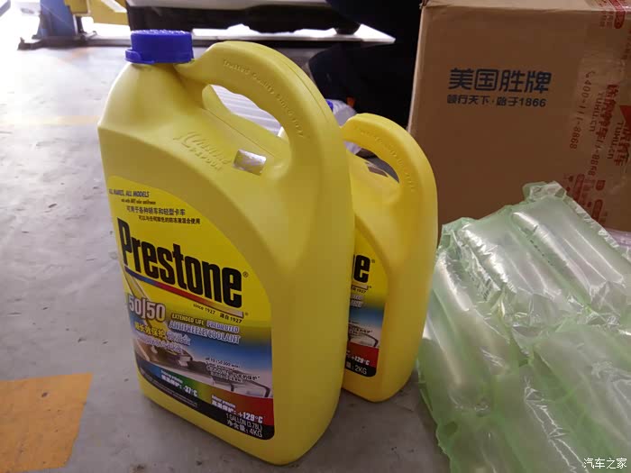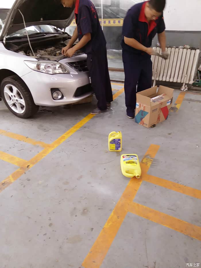 好了开始正题,周六中午吃过饭前去预定好的龙腾汽修,这是途虎的合作店铺,验证了单号后,把车开进了起升架,更换师傅是李师傅和他的徒弟,先是给我看了看邮寄过来的箱子有无开封,然后又看了下防冻液,并扫描了二维码,正品,完全没有问题。一起购买的还有水箱除锈剂,李师傅说这东西好是好不要太经常用,有利就有弊,呵呵还是挺有责任心的,师傅先把除锈剂添入防冻液,怠速运行了大概十分钟,开始排防冻液,怕防冻液放不干净用气枪吹了吹,确保干净之后,师傅貌似先把连接水箱的管子摘掉,至于为什么不是很懂,但师傅说是正常程序,然后开始更换防冻液,6公斤刚刚好到MAX线下,不多不少,(途虎自动匹配的还挺准),把管子连好后,可开始试车,轰了大概半分钟到一分钟的样子,确保没泄露,没问题后,算是更换完毕,李师傅还负责的给我留了电话号,说发现问题及时联系。途虎非常棒,从线上到线下。防冻液顺利更换完毕。