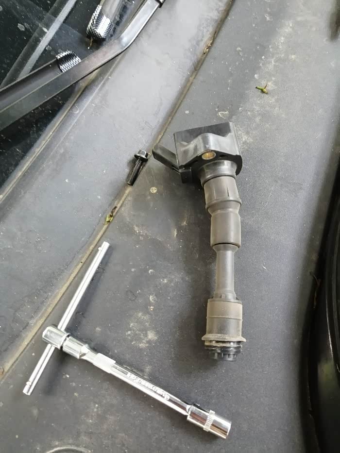 用火花塞套筒松开火花塞,然后把点火线圈插进去,像这样吸出来。新旧对比一下