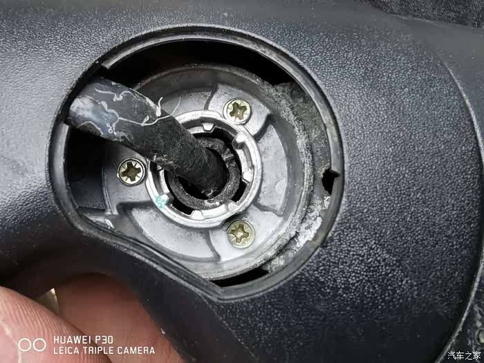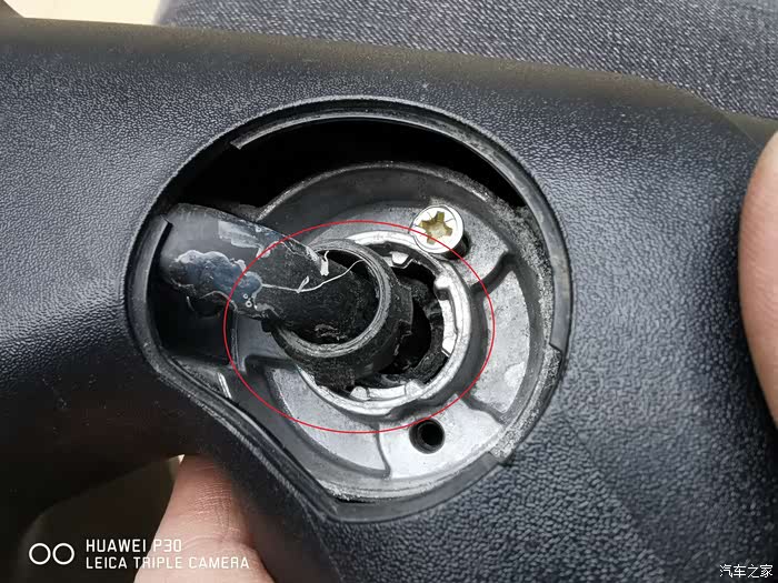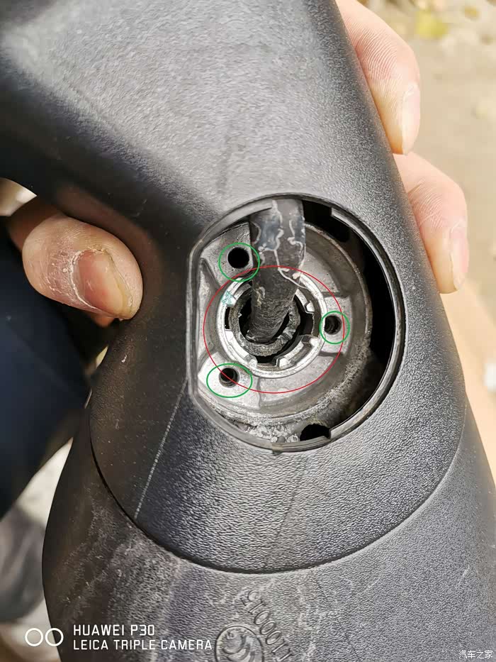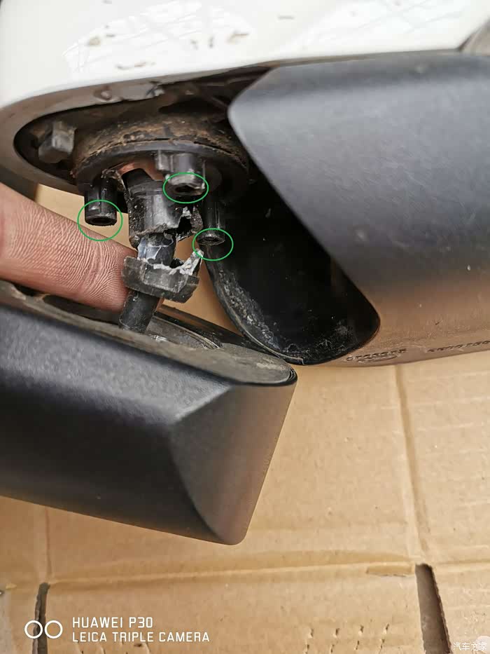侧面拍摄,断痕更清楚。上面有白色的塑料,是用AB胶粘过的痕迹,等了24小时,表示AB胶根本粘不牢,强度达不到。细心观察,可以用螺丝加固。如下图,绿色圈的孔,严重怀疑这里是汽车厂家预留的螺丝位置,但他们没有上螺丝,