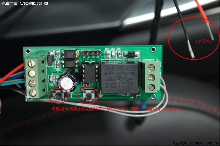 这就是该电路板。输出端左侧从上到下4点依次是 +12V,+档,-档,地线。右侧3点依次是继电器输出常通、常断,地线。常断点接通汽车M档电路板的M点。