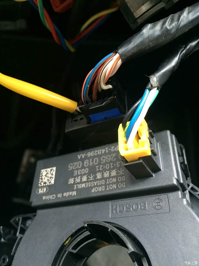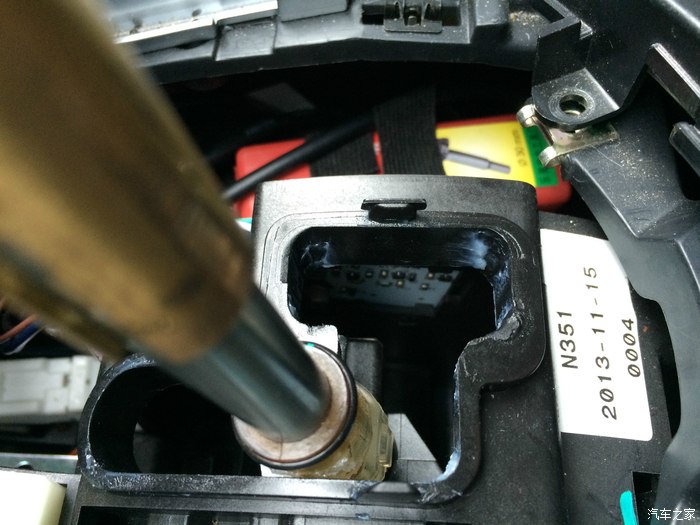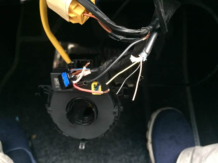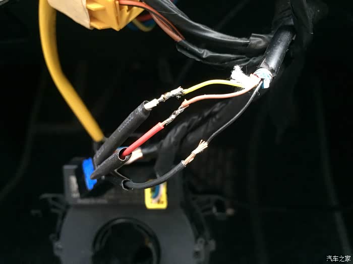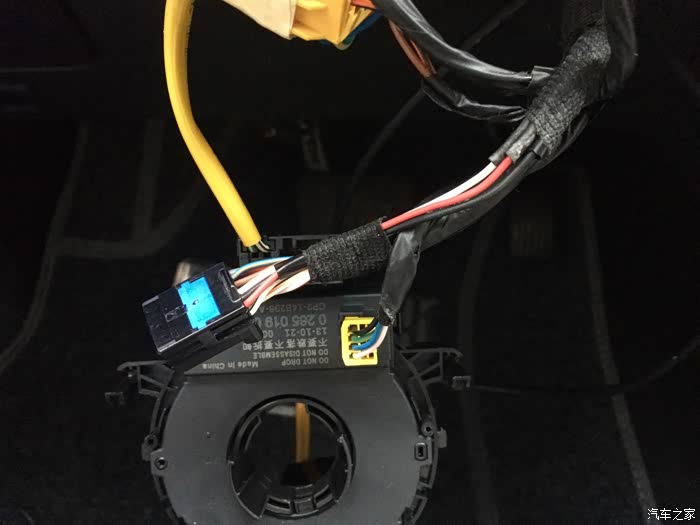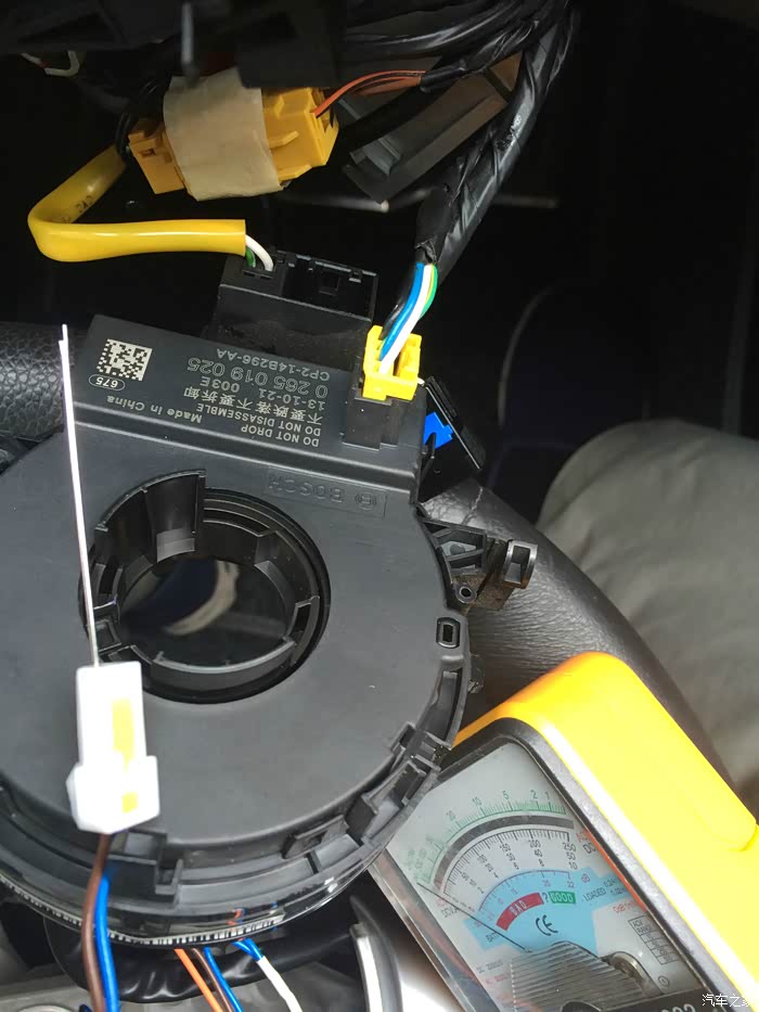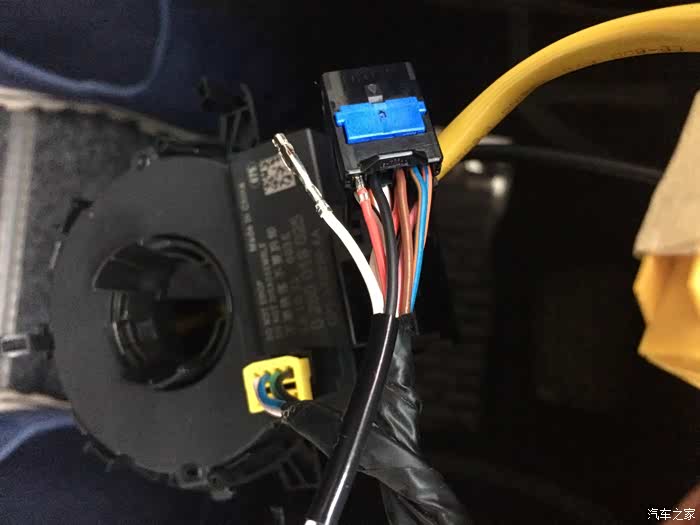 到车上测试确认游丝的引脚。也正好有3个空脚。方向盘的游丝插头插上,测试车上的游丝插座,能一一对应导通刚安装的3个引脚。
