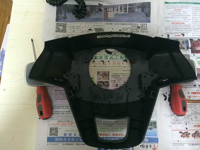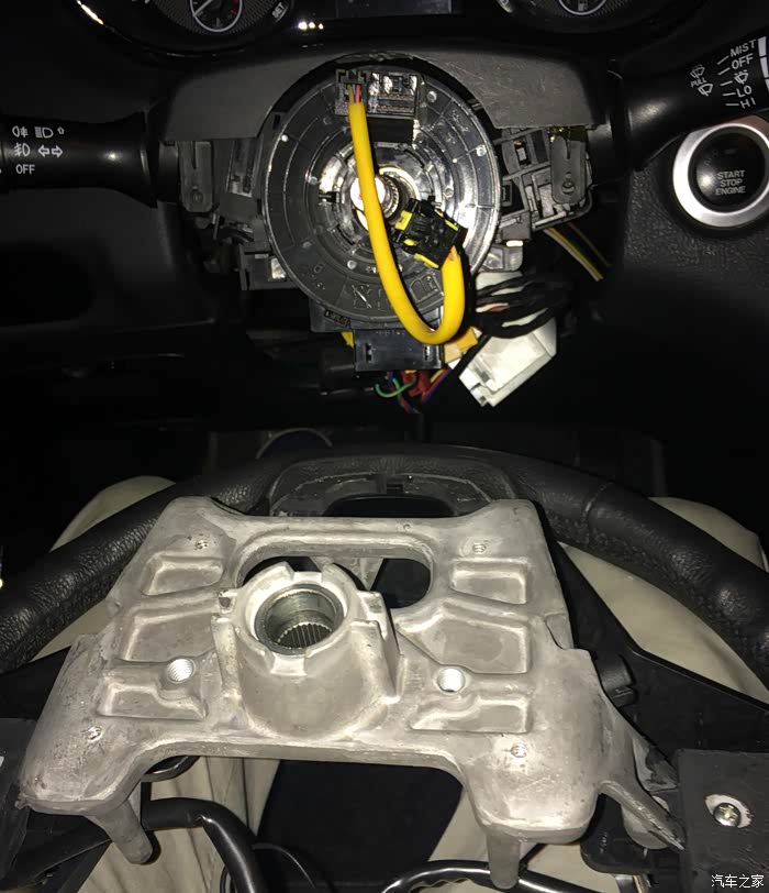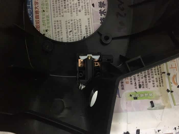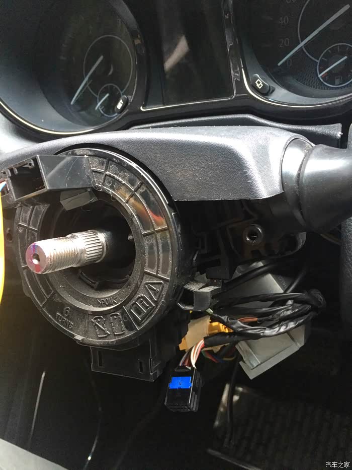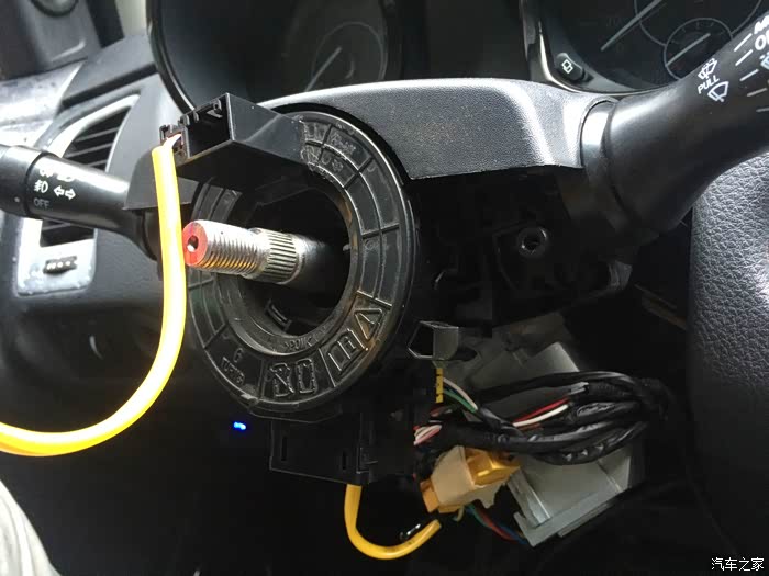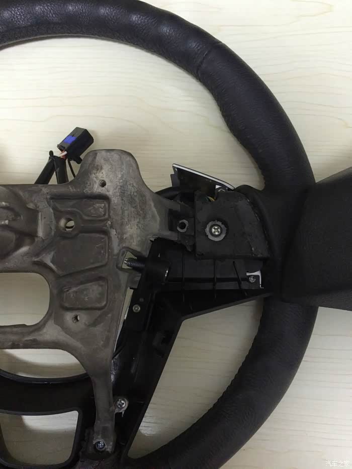 到车上拆方向盘。首先拆掉中心气囊。左右两边的螺丝拧松,就脱出来了。