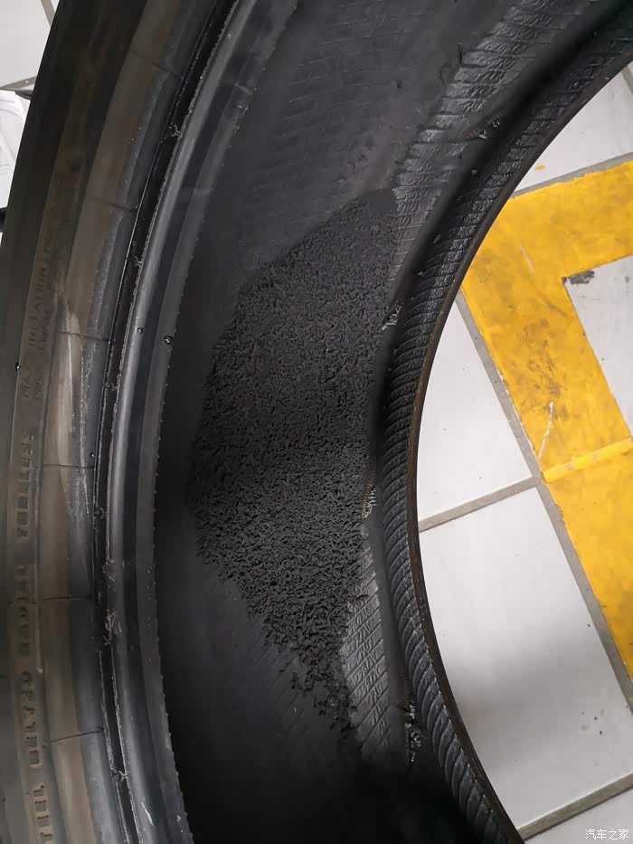 严重磨损的胎壁,还好轮毂没坏