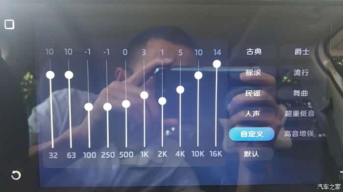 19款优享提车一个月,别的都满意,就是车机的音质实在是不咋的,界面没均衡器可调,只有在酷狗播放器的蝰蛇音效的可怜的3种音效可用。今天逛大熊论坛无意中看到一大侠跟帖说斑马机有内置均衡器,自家车上按方法果然看到在系统设置中有这藏的很深的10段均衡器,音质大为改观。方法:点系统设置-关于本机-产品型号那项快速连点3下还是5下忘了,会跳出个密码输入框,输入7654321确定,进去就可以看到10段均衡器了,剩下的自己调吧。不过有一个 好像每次关机后要进去再设置,不能保存设置。