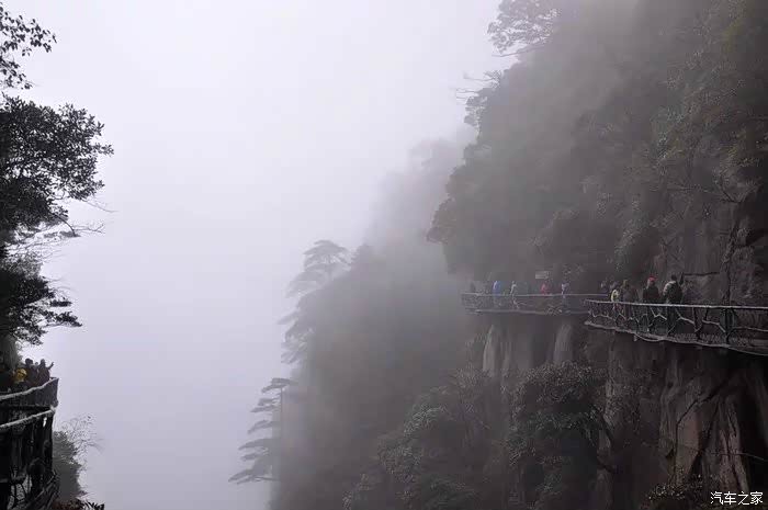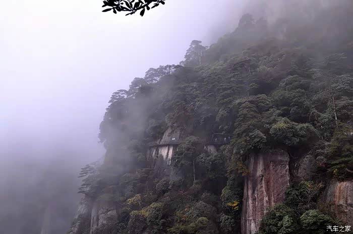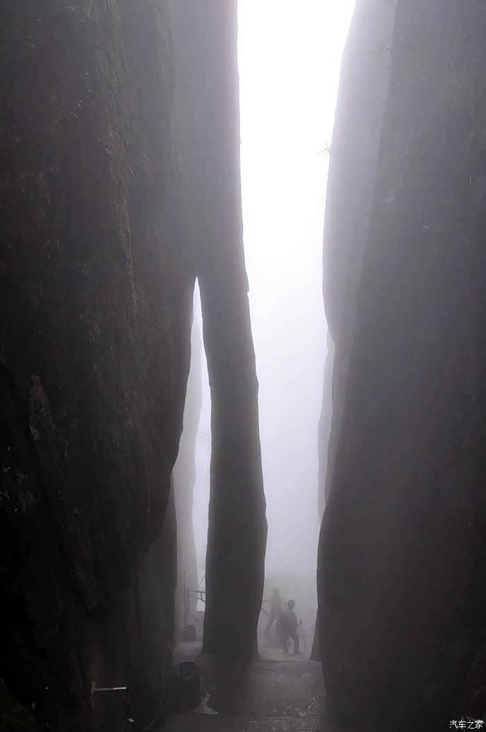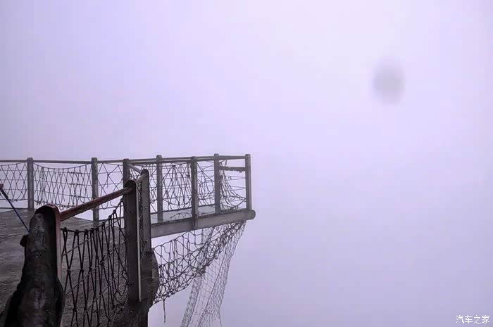 当缆车在上升一阵以后,我们却发现天色竟一点点阴沉下来,山间的浓雾像海浪一样层层涌来,瞬间眼前的世界已经白茫茫的一片,五米之外竟也分辨不清。我们的心悬了起来:“这么大的雾在山上能看到景色吗?”