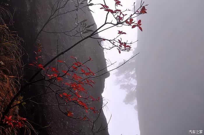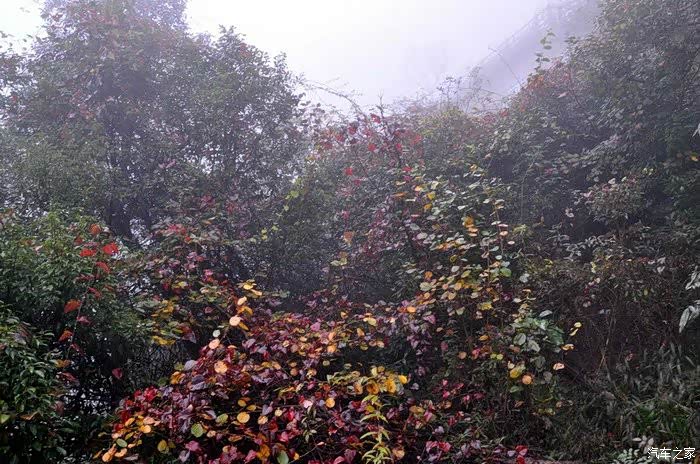 环视四周,水气氤氲,雾气弥漫,不见峰影,只有层层密林和叠叠树枝,幽幽深深,迷人致远。山崖峡谷中的丰富色彩吸引着我不停的拍照。
