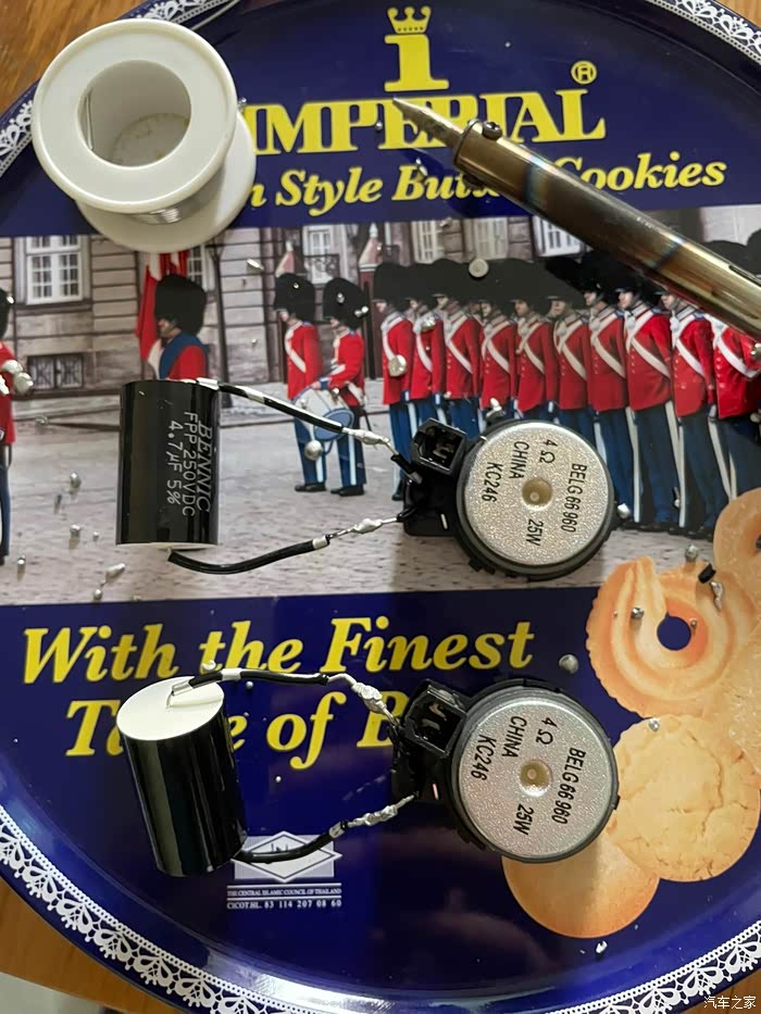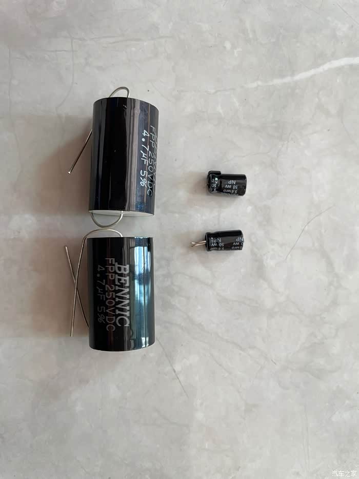 原车用的是5.6uf 50v的普通电容,高音很小,基本没声,贴着耳朵到A柱听都很吃力。