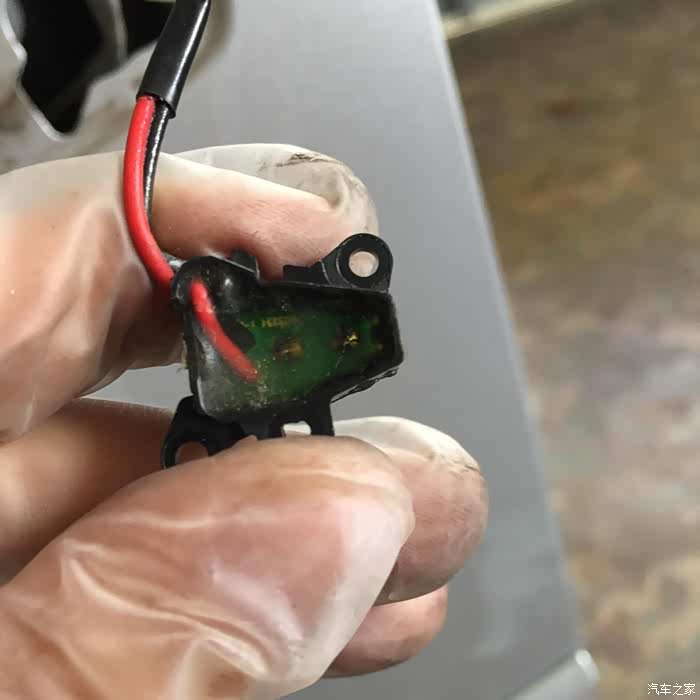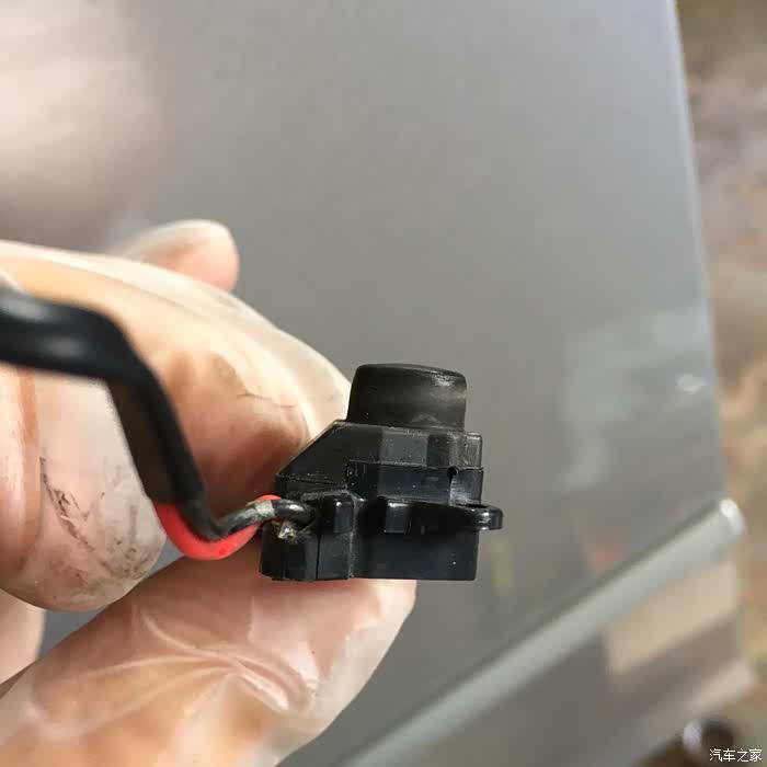 这是门锁按键的插线头。照片上边缘位置有一坨黑的橡胶是导线穿过车门铁皮孔后的密封。