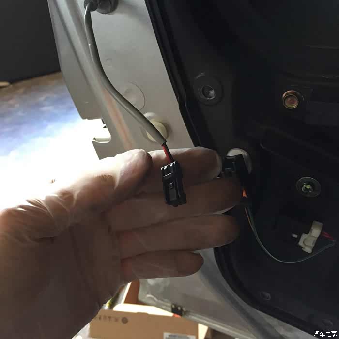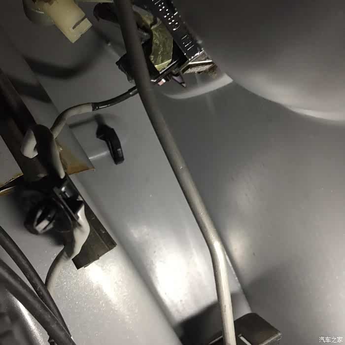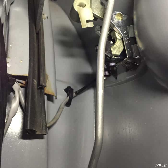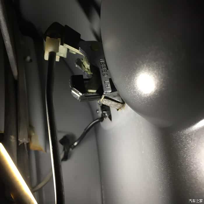 照片上边是门内衬,下边是车门,中间能看到左右各有一条黑导线,左边粗的是车窗升降键的导线,右边是刚才提到的照明电线。拆卸内衬的时候需要把车窗按键那电源拔下,插口在升窗键正下方。