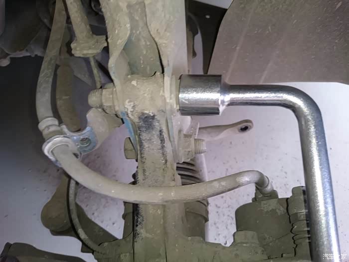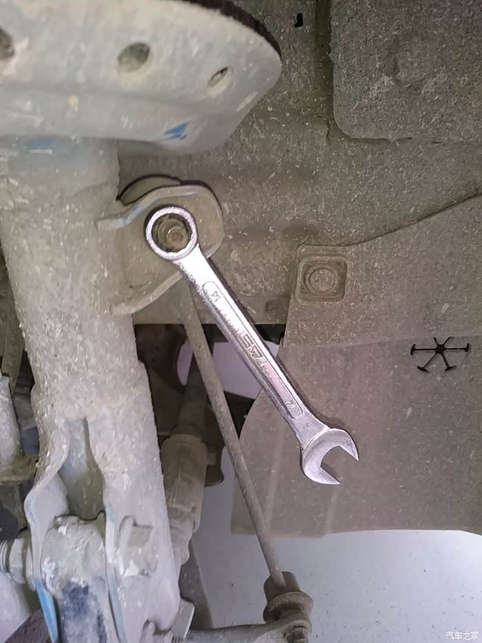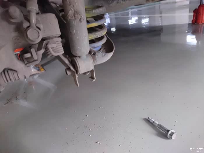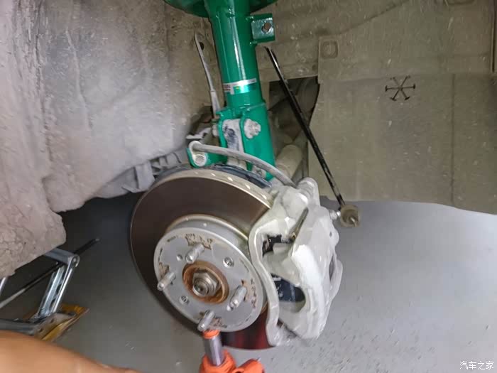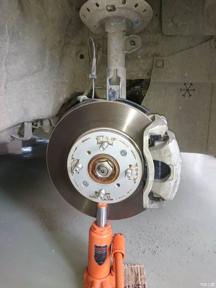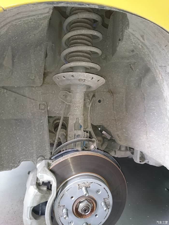 拆李子串下螺丝,14的套筒,这里提醒一点,拆这个跟后弹簧相似,要把车前部左右两边顶到差不多的高度,要不矮或高的一边会给另一边一个很大的力,根本拆不下,拆的时候要用千斤顶顶住刹车盘,然后调整高度就轻松拆下了,用别的机械设备换的当我没说~
