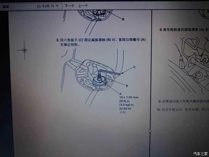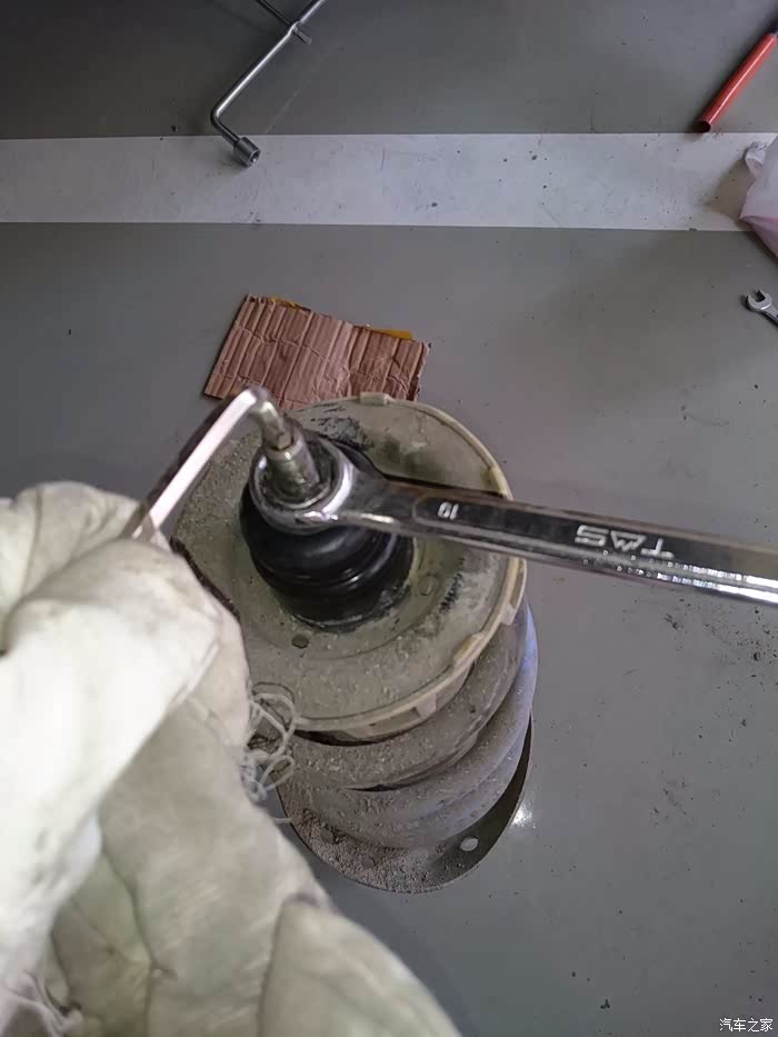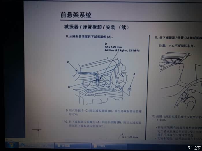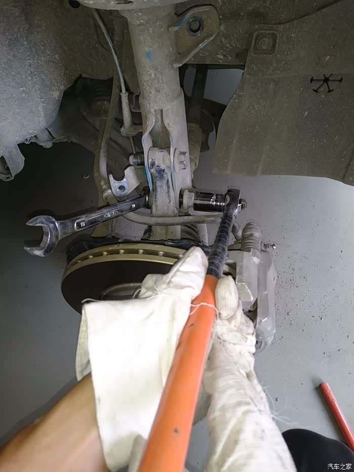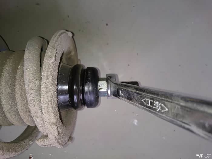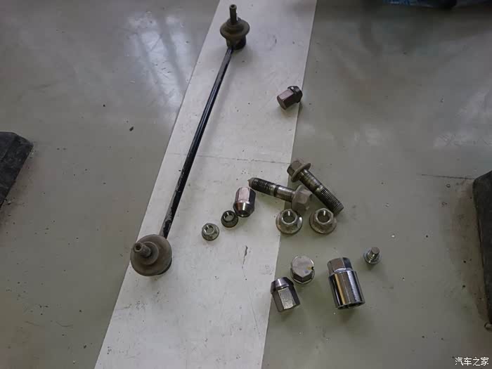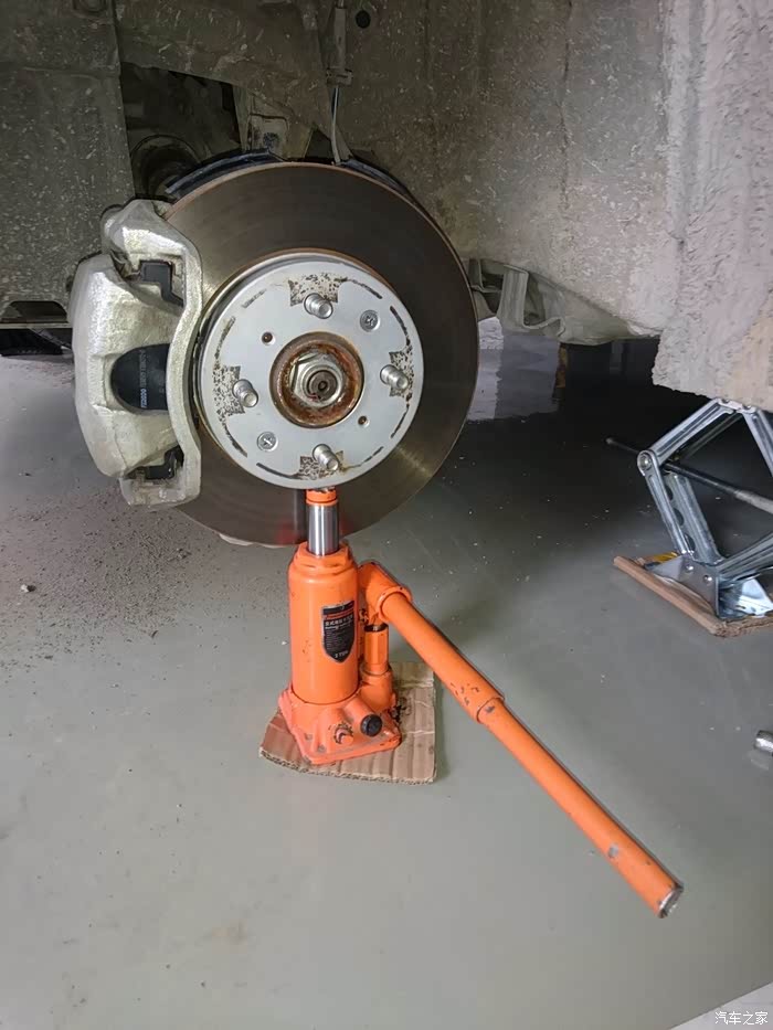 拆李子串下螺丝,14的套筒,这里提醒一点,拆这个跟后弹簧相似,要把车前部左右两边顶到差不多的高度,要不矮或高的一边会给另一边一个很大的力,根本拆不下,拆的时候要用千斤顶顶住刹车盘,然后调整高度就轻松拆下了,用别的机械设备换的当我没说~