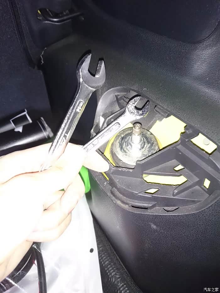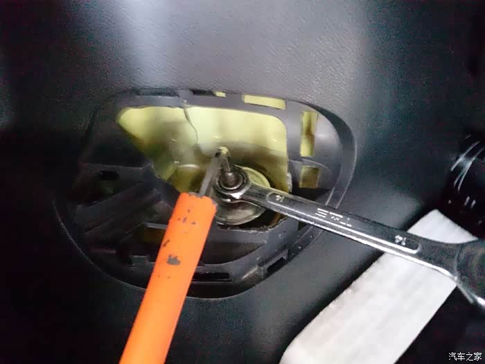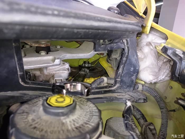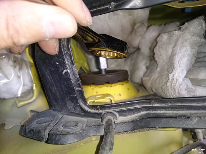 打开引擎盖,打开塑料板,拆左前避震,17的扳手,这个位置很窄,建议用棘轮扳手,很简单