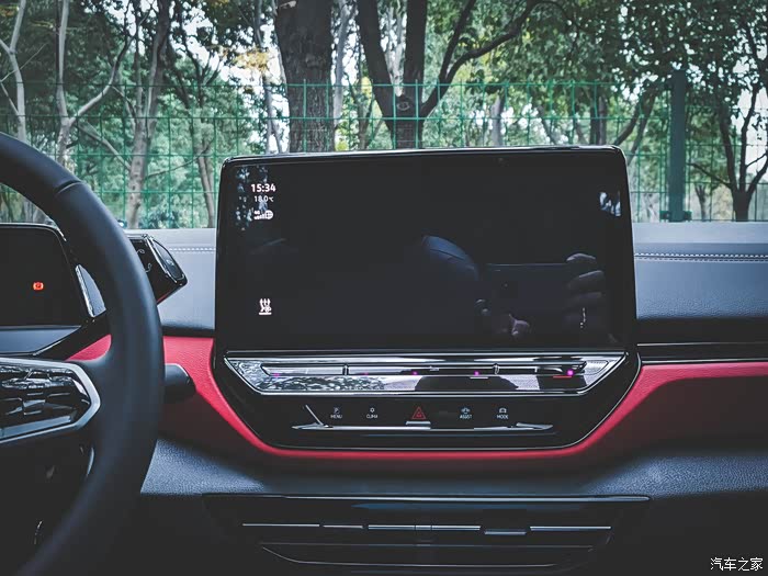 大屏中控,纯电车的中控界面复杂,基本功能设置都需靠它来完成,下方还带着几个功能性按钮,空调设置、驾驶模式等等