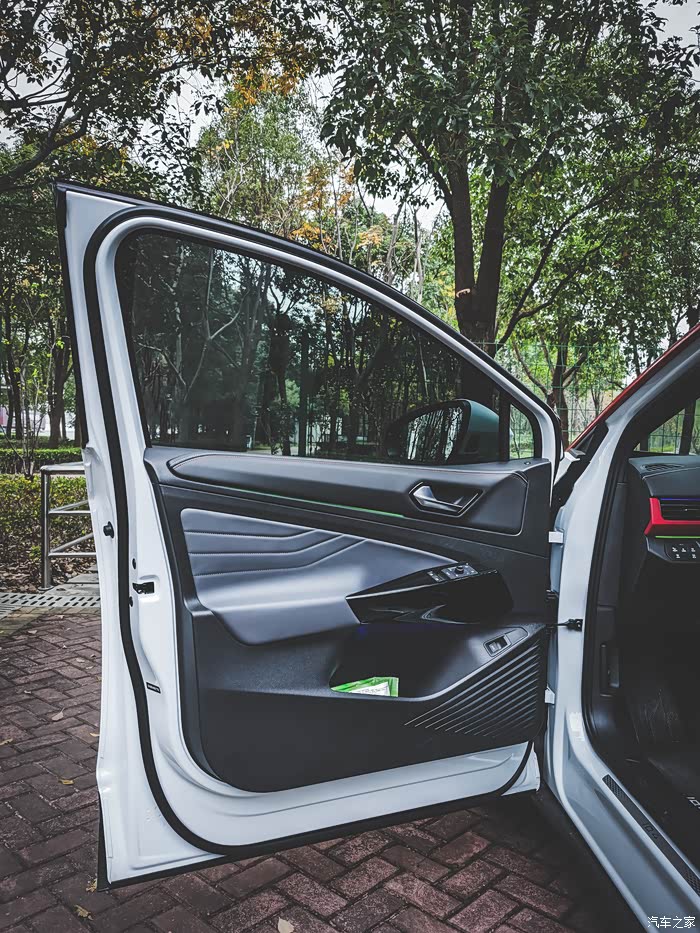 打开车门,内饰香槟色,镶嵌着氛围灯,行李箱开关,车窗控制开关前后需要按键切换