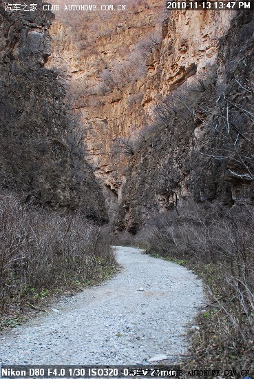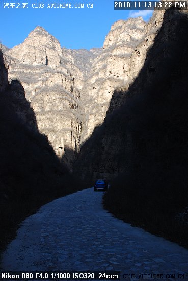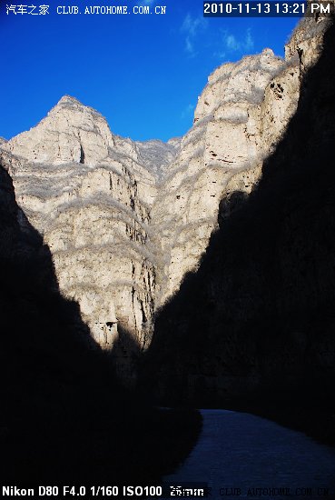 再走不远 穿过一个村子 就到了峡谷出 这是进入峡谷后 阳光被峡谷遮挡住 形成巨大的阴影