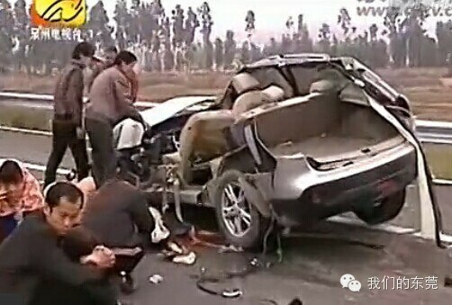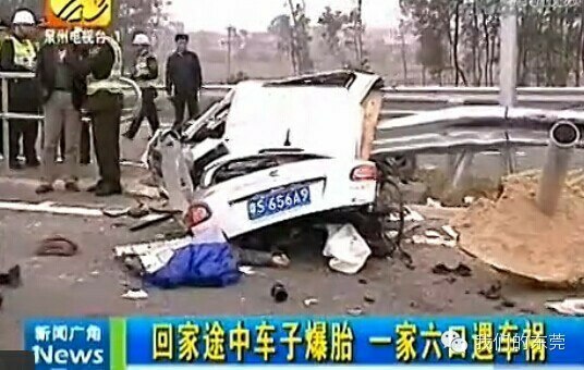 东莞车主王先生国庆回老家泉州,昨天去庙里进香,一家6口开着自己的东方日产车回家路上却遭遇车祸,现场情况非常惨烈,原因是车轮爆胎,瞬间撞到路中间的护栏,车身被护栏直接切成两半。全家6口,只有王先生父亲1人重伤幸存,其余5人惨死。记者:“可能爆胎以后车速比较快,所开日系车钢板也比较薄,所以整个车身被切成两半,据说当时驾驶员也被切成两半。”