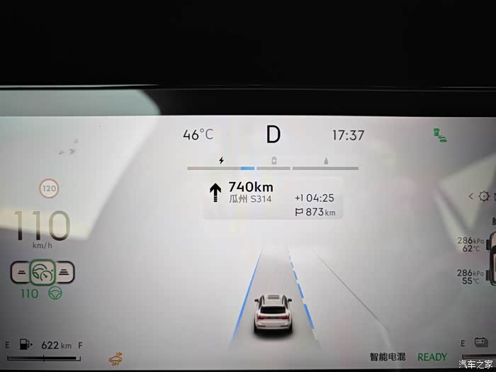 路过魔鬼的吐鲁番,气温46度,轮胎温度最高75度。而且胎压直接升到3.0(平时也就2.75左右)。我一直担心爆胎了。后面充电,用纯电模式跑,感觉前轮温度又下降了一点。