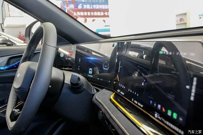 内饰最大亮点则在于中控台,欧尚X5 PLUS换装全新三联屏设计,并采用环抱式布局,三屏尺寸相加达到30英寸,科技感十足。三块屏幕从左到右分别为驾驶辅助屏、全液晶仪表、中控屏幕,三屏可互联互通,实现信息共享,比如导航信息、歌词等,通过三指划动即可。