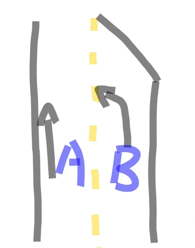 如图,双方都在正常车速范围内行驶,B车道提示前方汇入主道,没有路可走。