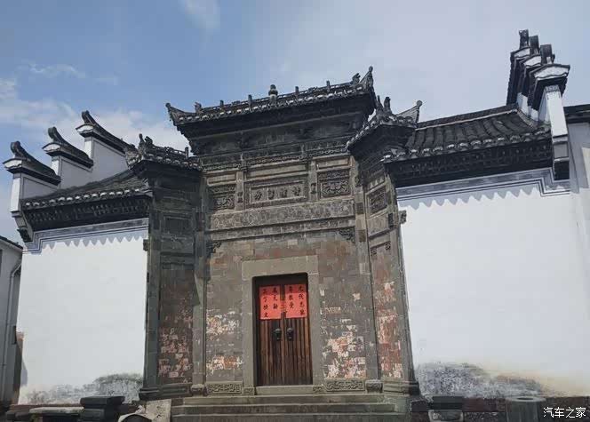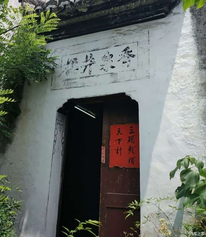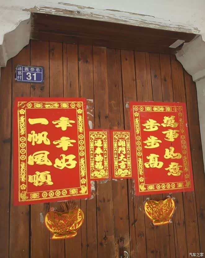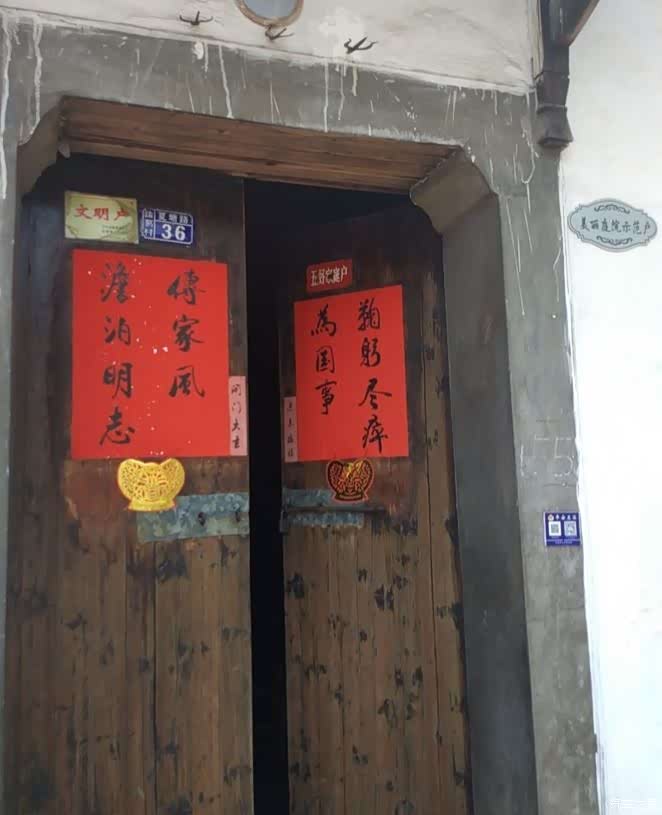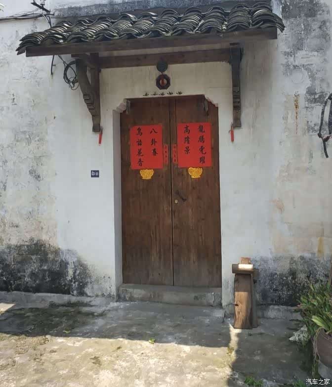 小路极窄,两个人并行都有困难。路边的小屋多为粉墙黛瓦的徽派建筑,不过这里的文化并不是典型的 徽州 文化,而是有着明显的道家文化印迹。几乎家家户户门前都悬挂着八卦镜、圆镜、铜钱等风水之物。有的人家窗子上方画着八卦中某一卦的符号。门上的对联形式很特别,写对联的红纸不是常见的长条形,而是打印纸的形状。上下联均写成两排,内容多为赞颂诸葛亮的诗词***中的句子,也有的就是诸葛亮***中的句子。对联贴在两片门扇正中,叫做门联。靠近中继的位置,又贴一对窄而短的副联。副联内容简单,多为“开门大吉”“迎春接福”之类的吉利话。门联下贴一对元宝,是用金银纸剪的。有的人家元宝里会插上几枝看起来像谷穗的东西或者已经燃尽的香。有的人家门框两侧的抱柱上,各挂一只木雕的葫芦形或花瓶形香插,香插里一般都有燃尽的香。