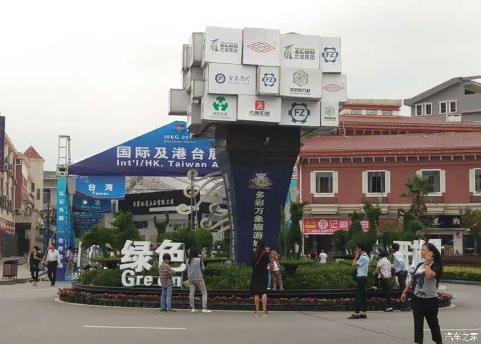 很多人花坛拍照,火炬造型上全是参展商LOGO。