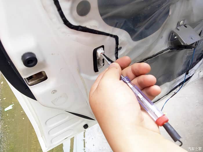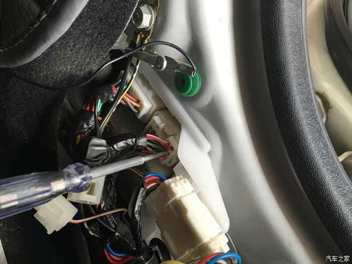 左侧的中控开关锁信号线就从这里接的,我这边是用电笔测了下的,到时大家就可以省略这个步骤了,下图就有说明什么颜色是开关锁的了