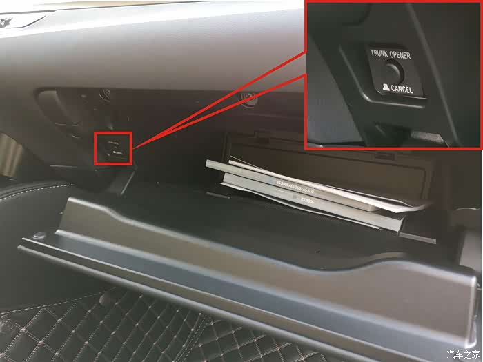 副驾储物箱,左边有一个行李箱安全系统功能开关,很多人都忽略了。这个开关可以锁住尾箱盖(轻按弹出后,此时电子钥匙、主驾位按钮、尾箱按钮都无法开启尾箱盖。用机械钥匙锁住副驾储物箱后,电子钥匙可以交给任何人如泊车人正常驾驶车辆而无法打开尾箱)。