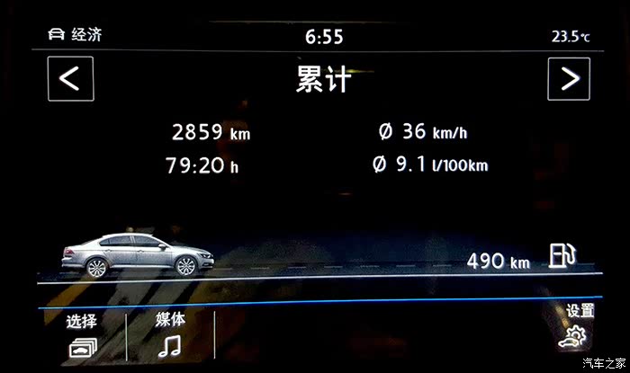 累积画面显示车辆设定在“经济”模式,个人比较喜欢的模式,累计行驶2859公里,行驶79小时,平均车速36公里/每小时,油耗9.1升/百公里,剩余油量按照之前的油耗上能行驶490公里