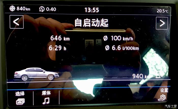 这是“自启动后”画面,显示导航剩余840公里,休息停车40分钟,平均时速100公里,行驶里程646公里,再加上重庆出发前市内跑的173公里,正好等于819公里,可惜没有记录下加油前续驶里程。应注意的是这646公里平均油耗才6.6。加满油后显示续驶里程940公里,实际这是按照整箱油计算的,全部是高速则会轻松超过1千公里