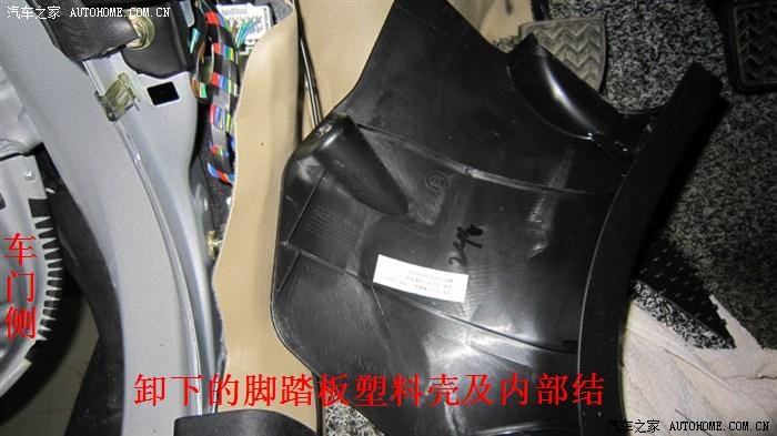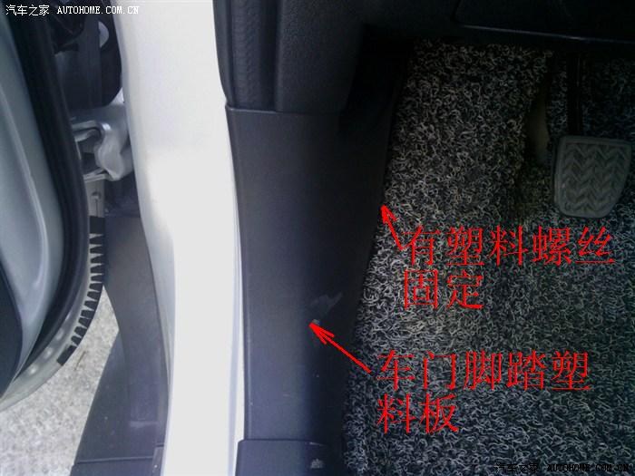 前门踏板塑料板分左右两侧,位于迎宾踏板前部,由一枚塑料螺丝固定,拧开螺丝直接可以卸下,目的:1、方便把线穿入车门、车室;2、接搭铁线。
