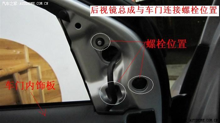 这三颗螺母(白色圈所示)把倒车后视镜总成与车门连接固定,拆卸倒车后视镜总成前,可先行拆卸后视镜片,当然也可以拆了总成后再拆后视镜片。