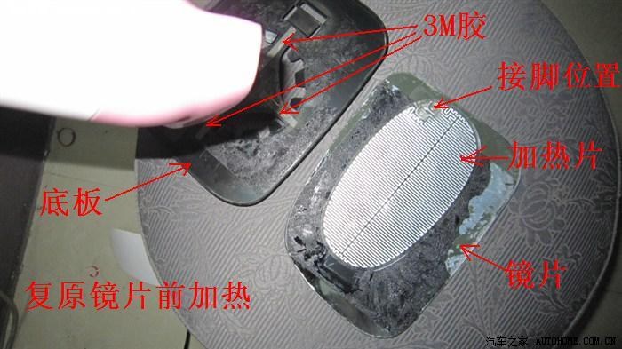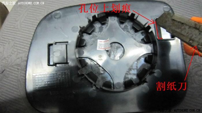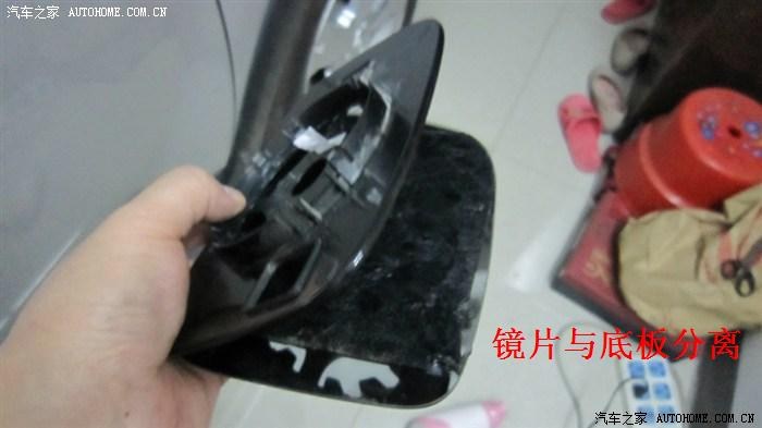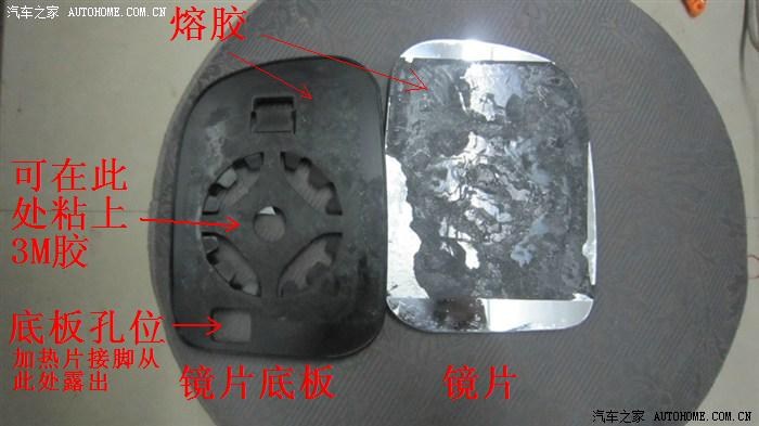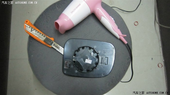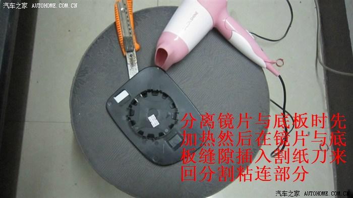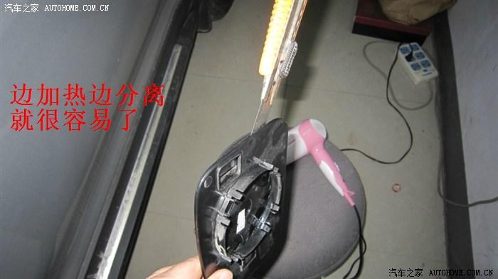 3.2.2——镜片拆卸,坛里置顶的全车实用指南有逍版主的拆卸贴,大家去看看就知道如何卸下了,在此就不再重复。这里说一下如何把镜片底部塑料板与镜片分离,由于镜片和底板是用熔胶粘合的,坛里曾有车主用手一点一点的掰,非常吃力,手指都痛了,还担心弄破镜片,这里教大家一个简便的方法:先用电风吹加热一下熔胶,待熔胶变软后,用割纸刀插入镜片与底板之间,边加热边慢慢切开镜片与底板之间的熔胶,切割一圈后就可以把镜片与底板彻底分离开了,非常容易。