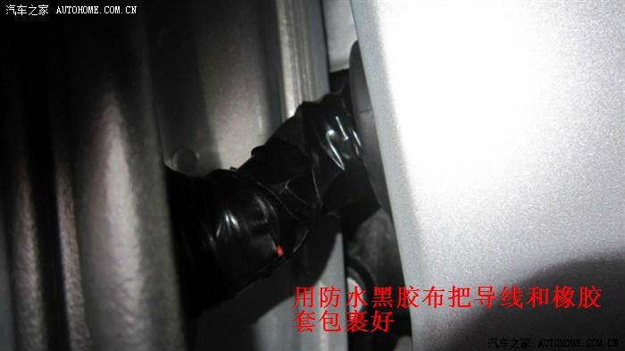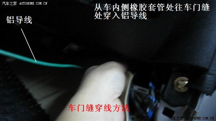 这是安装的难点,原车门缝线束靠一橡胶套联通,打开车门后线束不成直线,有点弯,橡胶套里的线束较粗,我们要穿入的导线细软,门缝空间狭窄,直接穿肯定行不通,所以要在橡胶套合适的位置穿破一个洞,所选择的位置一般是离地面低的位置,注意考虑低位不容易进水,穿好后再用防水胶布包裹就可以了,需要注意的是,导线不要直接接触车门和车室两个洞口金属边缘,导线通过洞口时要保证导线在橡胶套管里面,以免日后长期开关门的动作使洞口金属边缘与导线产生摩擦,久之损坏导线造成短路,切记!