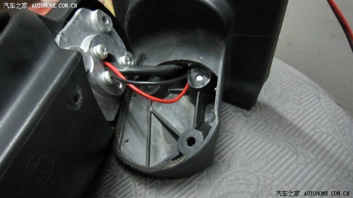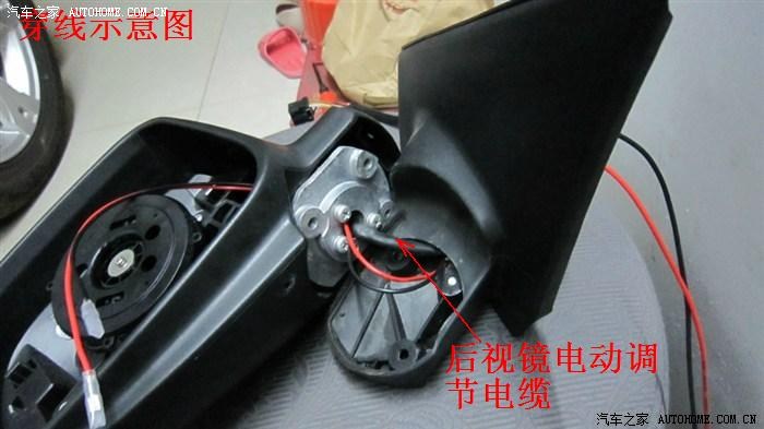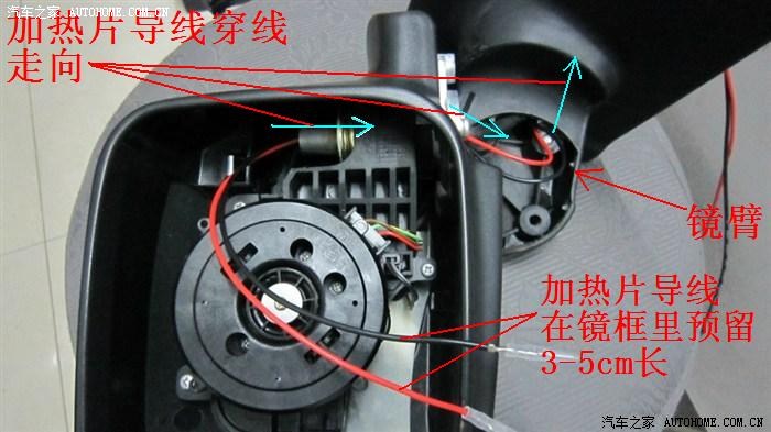 倒车后视镜总成里的走线,没什么特别之处,只要顺着其原有的电机线束来走即可,需要注意的是,加热片接脚处的线要留3-5cm的宽余,防止调节镜片时导线受到牵拉、接脚松动等,接好后直接按原路走线到车门并穿进车门内里待穿入门缝。加热片接脚不分正负极,分别接上红黑两导线即可。