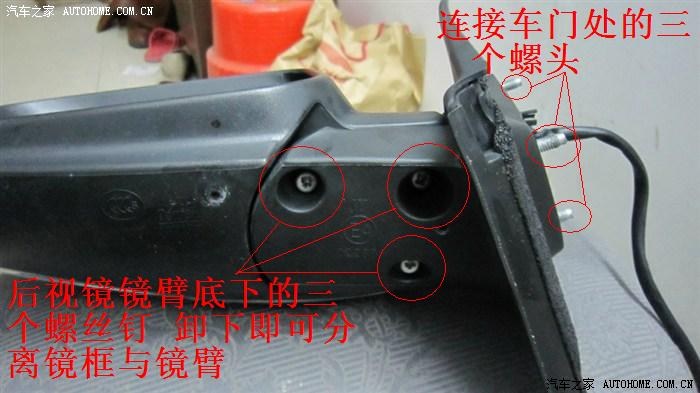 镜臂的底部有三颗螺丝固定,直接卸下即可。拆卸镜臂必须先拆卸总成,同时拔掉倒车后视镜电机线束插头,否则有可能刮花车门漆哦!