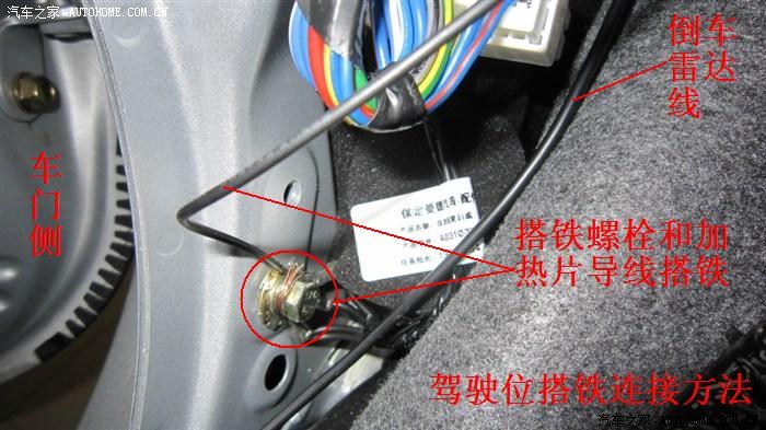 之前为了省事直接把回路(黑色线)直接接在车门的螺母上,以为只要是金属就应该算是搭铁了,结果试通电时,听到车体有时会发出“嘀嗒、嘀嗒”的电开关响声,根本不行,分析原因,应该是接触不良!所谓“有搭铁连接线处”,是指有用螺母把一些线束直接固定在车身上的金属地方,这些部位在车里有很多,选择前门脚踏塑料板下方的搭铁连线作连接,只是方便而已。