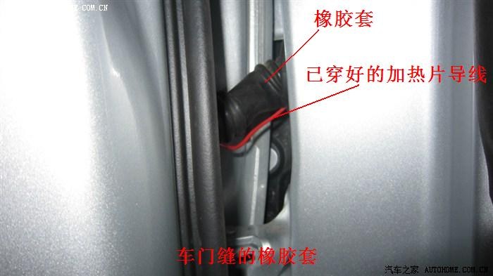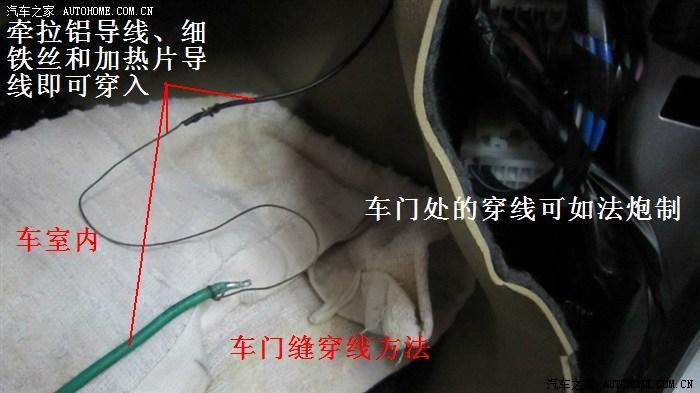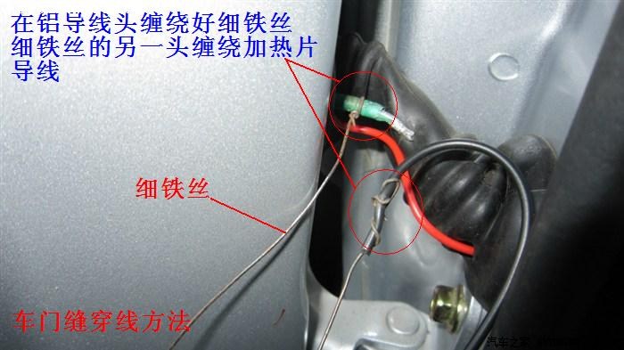 穿线时,先用一根2平方的铝线或铜线在车内侧或车门扬声器孔侧穿入橡胶套内,用手指在门缝处感觉铝线或铜线头的位置,调节好要穿出橡胶套的位置后直接穿出孔来,如果不好穿出,可对准铝线头部位用剪刀尖辅助破孔,穿出铝(铜)线头一小段,用一根长度合适的细铁丝,一头缠绕铝(铜)线头一侧,另一头缠绕加热片导线,这样就形成一牵拉穿行组合,依次牵拉铝(铜)线、细铁丝、导线,即可穿过,同样办法穿对侧即可,最后用防水黑胶布包裹完成。