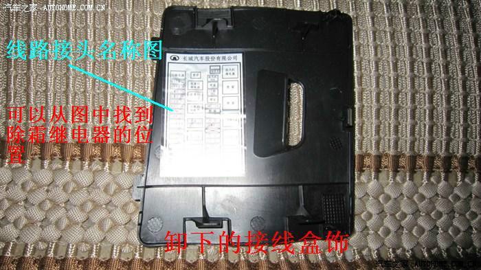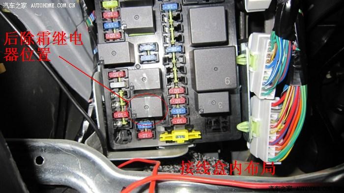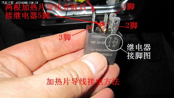 直接拔下接线盒里的后挡风玻璃除霜继电器,可以看到继电器有4个插脚,分别是1、2、3、5脚,继电器上有图示,按图示找到5脚,把并联好的红色导线接在5脚上,然后直接插回去即可,最好焊接,避免日久氧化,造成接触不良。