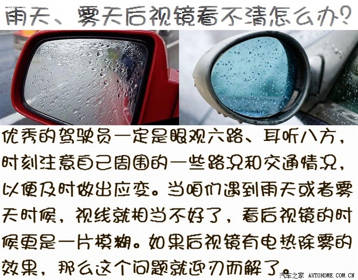 早就有安装倒车后视镜加热片的想法,台风“海燕”过后就确定一定要安装了。也许你会问“能有多大作用”,之前雨天驾驶妹妹的雅阁,打开其加热功能5分钟左右,宛如晴天一样;也或许有人会问“后视镜持续加热会不会烧坏镜片”,我想这大可不必担心,因为镜片是在室外的,外面的空气流动性大,加热片产生的热量与空气的热交换也很快,留在镜片上的温度只有40度吧,既不会烧坏镜片也不会影响烘干作用。