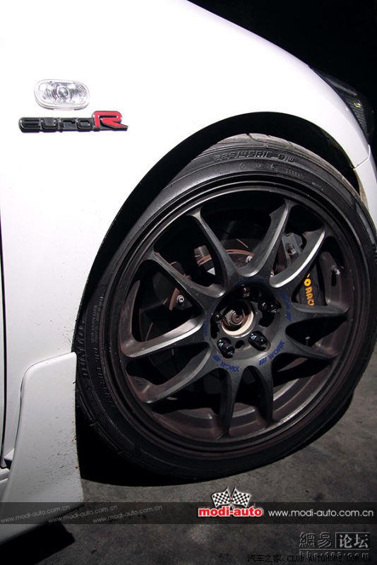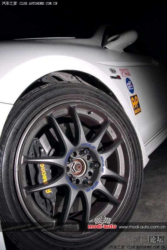 一般四轮碟刹民用车的刹车系统都是前后单活塞式设计,哪怕是行政级房车雅阁也不例外,加上自身重量的劣势,原装轮胎配原装刹车系统在一般程度上的疾走已不能应付,车主免得再度麻烦,一口气就更换了英国AP Racing的6活塞刹车卡钳,看得出下手非常狠!换上18寸WORK轮圈后,刚刚好容下6活塞AP卡钳配330mm直径刹车碟。轮胎来自邓禄普的DZ101系列运动胎,轮胎规格为225/45R18,该系列轮胎在市面上很常见,性能属于入门级别,胎噪、排水、抓地力之间取得了一个较佳的平衡点,胜在性价比足够高。