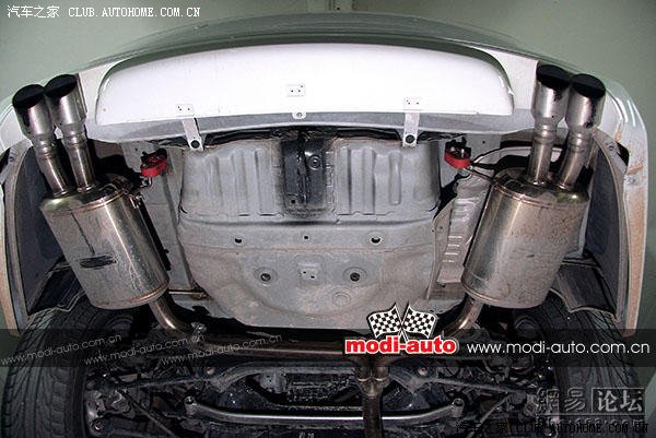 排气系统头端由飞龙排气自行设计,中、尾段排气系统则是车主的喜好,其实也为迎合无限空力套件尾裙的形状需要,从管径形状上可以知道这是为NA引擎研发的(傻瓜都知道雅阁没有涡轮版本),中段管径为60mm,尾段直径为54mm,分叉后的管径更缩减至45mm,加上两个大型尾鼓的回压作用,引擎中低转速区域下才是发挥的地方。钻进车底发现了一条长长的(大概一米半的长度)泄压排气管出口已经到了中鼓位置,感觉很是特别,本次车主再次回到改装店的原因之一就是改装这个泄压装置,本来泄压阀泄压口如同普遍的安装放置于引擎舱下方,不过得到的是犹如没有隔音效果的放气声影响到车内的交谈,所以唯有出此办法作尝试。